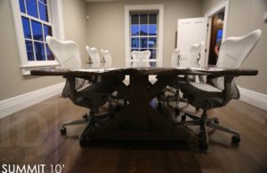 Description: 10 foot Boardroom Table – 52 inches wide – Sawbuck Style Base – Reclaimed Hemlock Threshing Floor Construction – Premium epoxy/satin polyurethane finish – Barnboard Greytone Treatment – 2″ Thick Top – Center hole for phone cables – Original Barn Floor Board Edges Kept