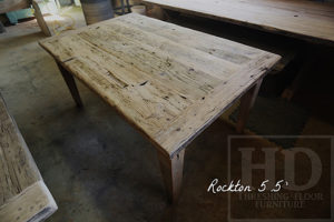 Specifications: 5.5 foot Harvest Table – 42″ wide – 4″x4″ Windbrace Beam Tapered with a Notch Legs – Reclaimed Hemlock Threshing Floor Construction – 2″ top – Premium epoxy/matte polyurethane finish