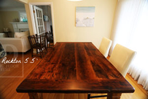 Specifications: 5.5 foot Harvest Table – 42″ wide – 4″x4″ Windbrace Beam Tapered with a Notch Legs – Reclaimed Hemlock Threshing Floor Construction – 2″ top – Premium epoxy/matte polyurethane finish
