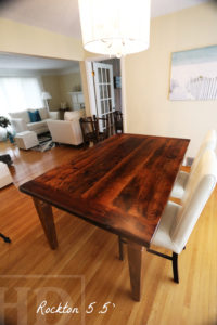 Specifications: 5.5 foot Harvest Table – 42″ wide – 4″x4″ Windbrace Beam Tapered with a Notch Legs – Reclaimed Hemlock Threshing Floor Construction – 2″ top – Premium epoxy/matte polyurethane finish