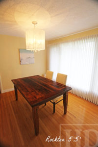 Specifications: 5.5 foot Harvest Table – 42″ wide – 4″x4″ Windbrace Beam Tapered with a Notch Legs – Reclaimed Hemlock Threshing Floor Construction – 2″ top – Premium epoxy/matte polyurethane finish