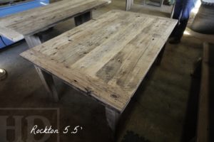 Specifications: 5.5 foot Harvest Table – 42″ wide – 4″x4″ Windbrace Beam Tapered with a Notch Legs – Reclaimed Hemlock Threshing Floor Construction – 2″ top – Premium epoxy/matte polyurethane finish