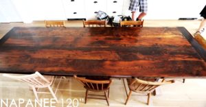 Details: 10 ft Reclaimed Wood Table – Trestle Style Base – 36″ wide – Reclaimed Hemlock Threshing Floor Construction – Premium epoxy/polyurethane finish – Greytone [Colour of Unfinished] Base – Original Barnwood Edges MaintainedÂÂ
