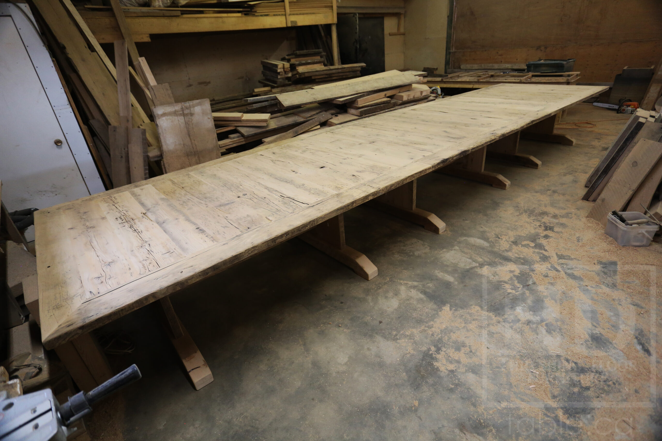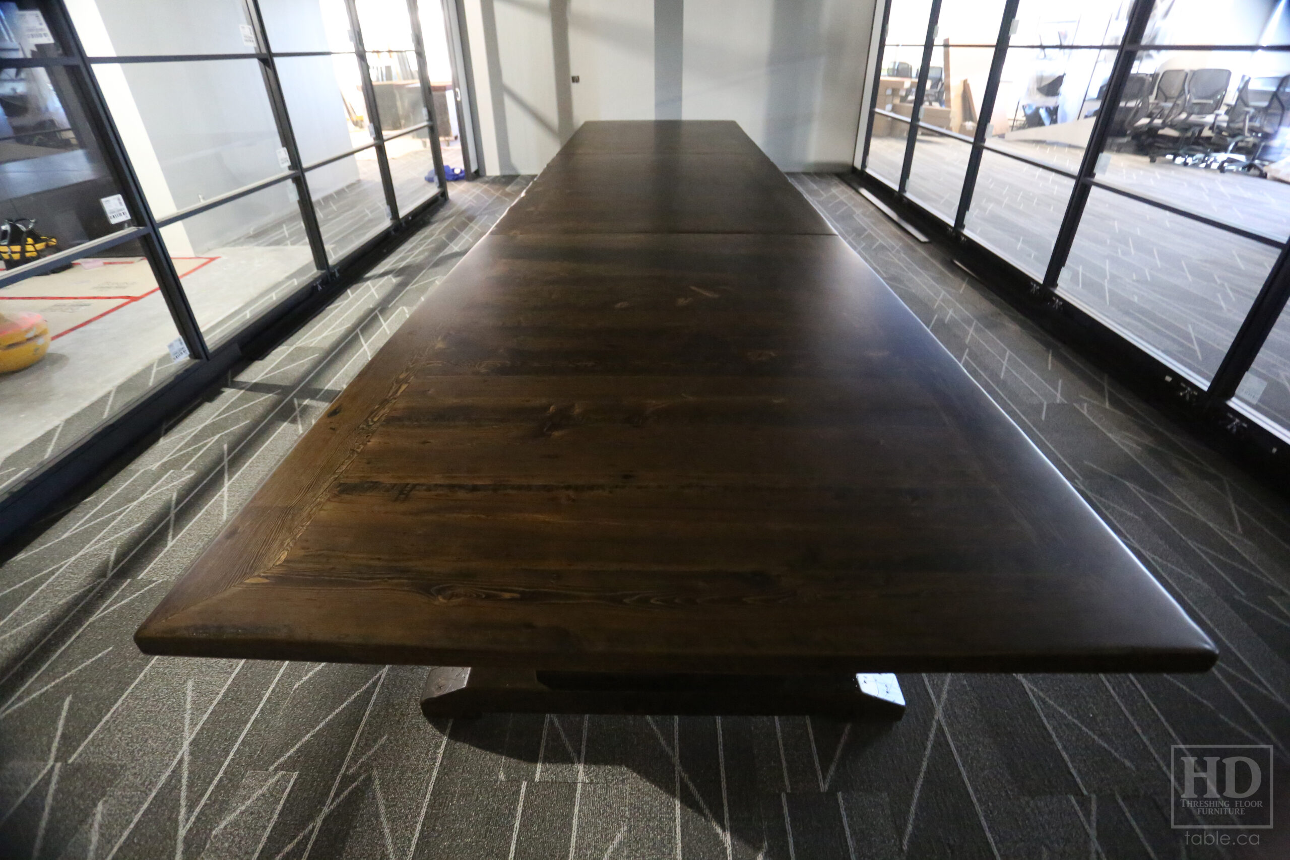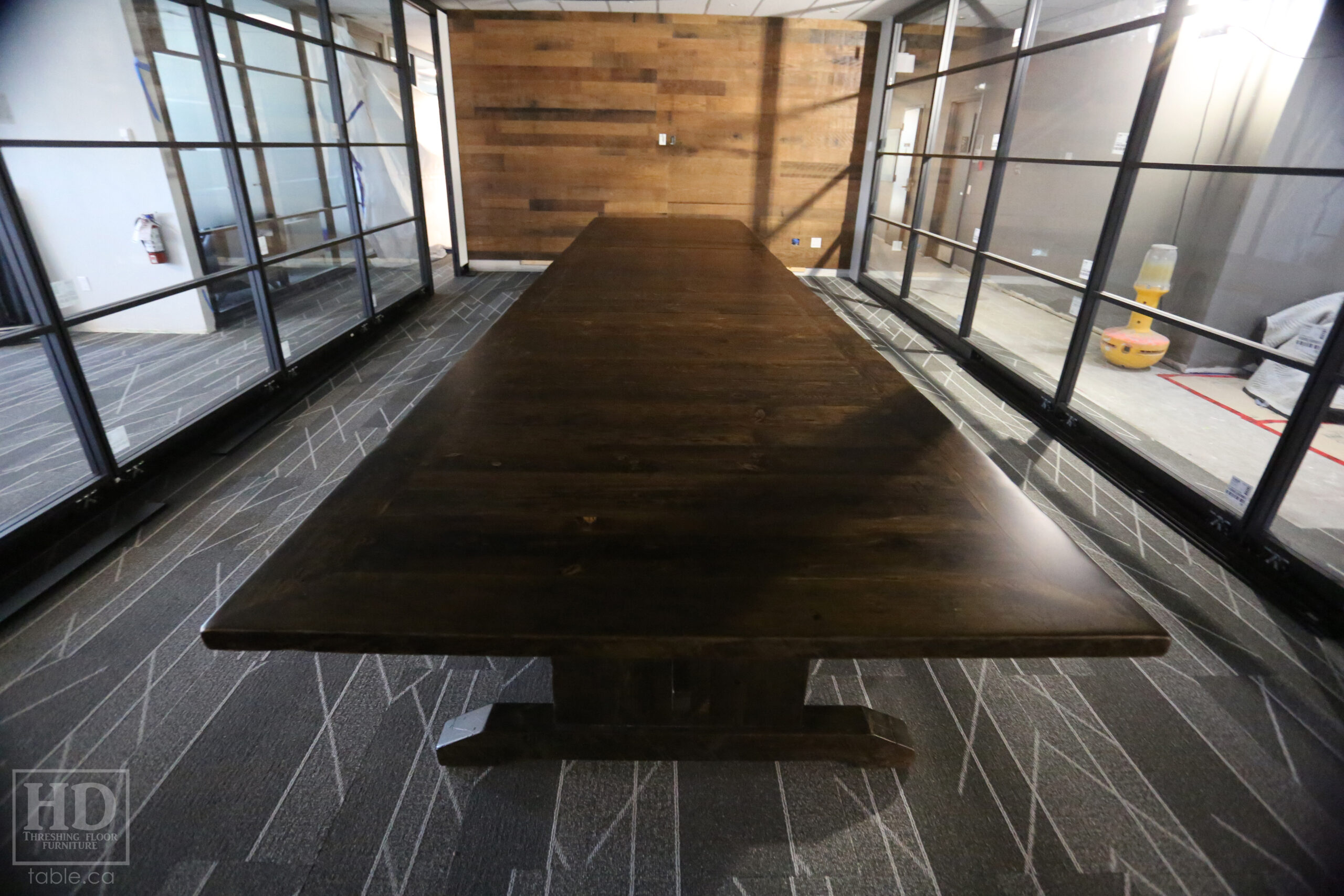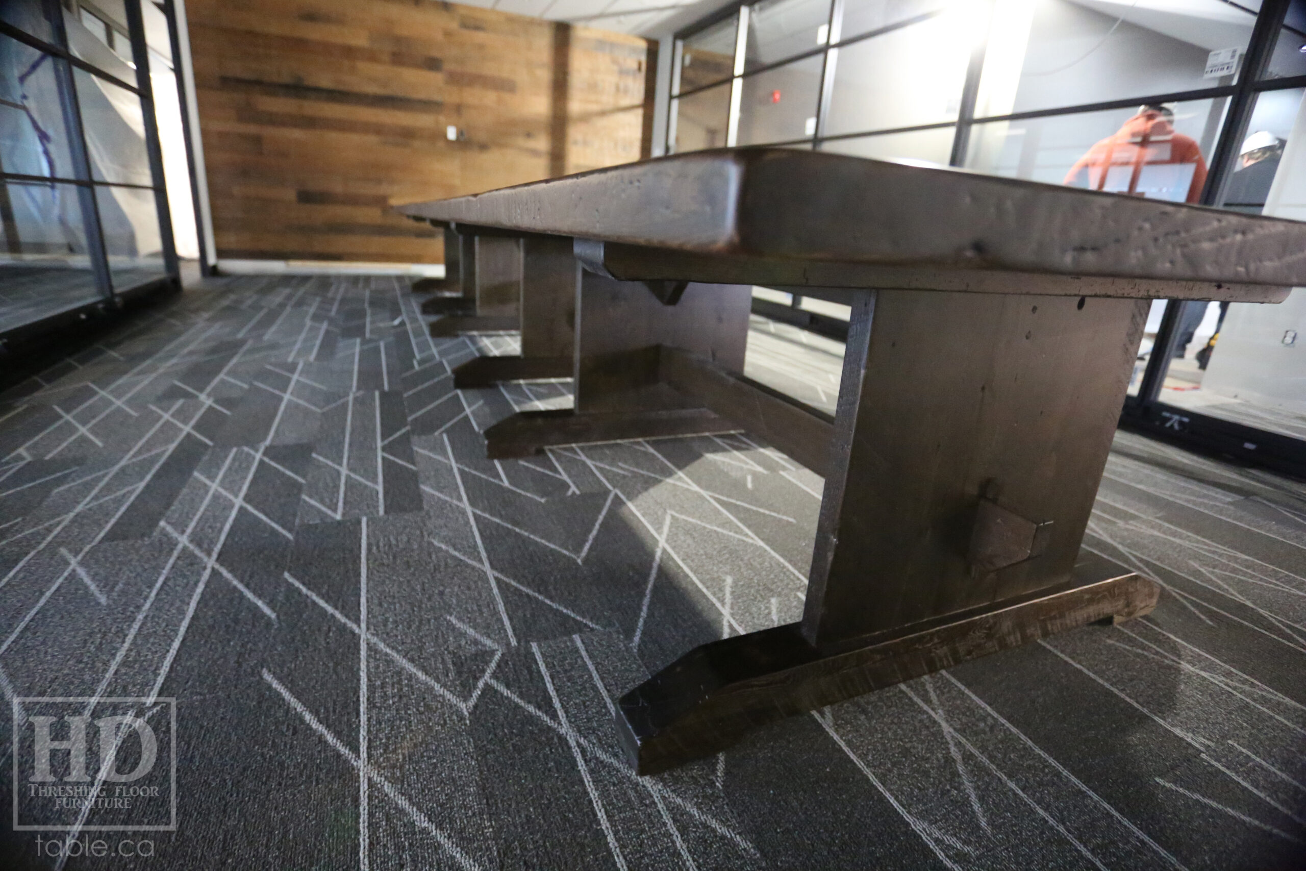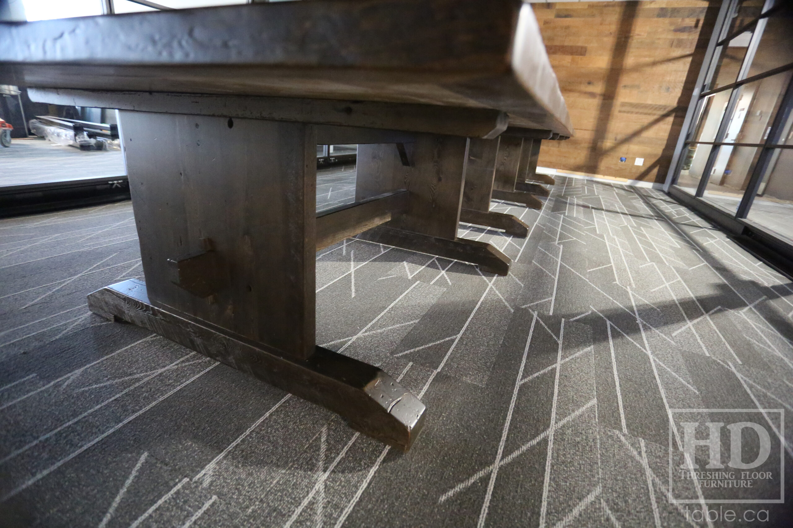 Project Summary: 21′ Ontario Barnwood Boardroom Table we made for an Ottawa Company – 60″ wide – Trestle Base – Old Growth Hemlock Threshing Floor Construction – Onsite final dowling 1/3 1/3 1/3 – 2 Posts Per 1/3 -Original edges & distressing maintained – Black Stain Option – Premium epoxy + matte polyurethane finish – www.table.ca
