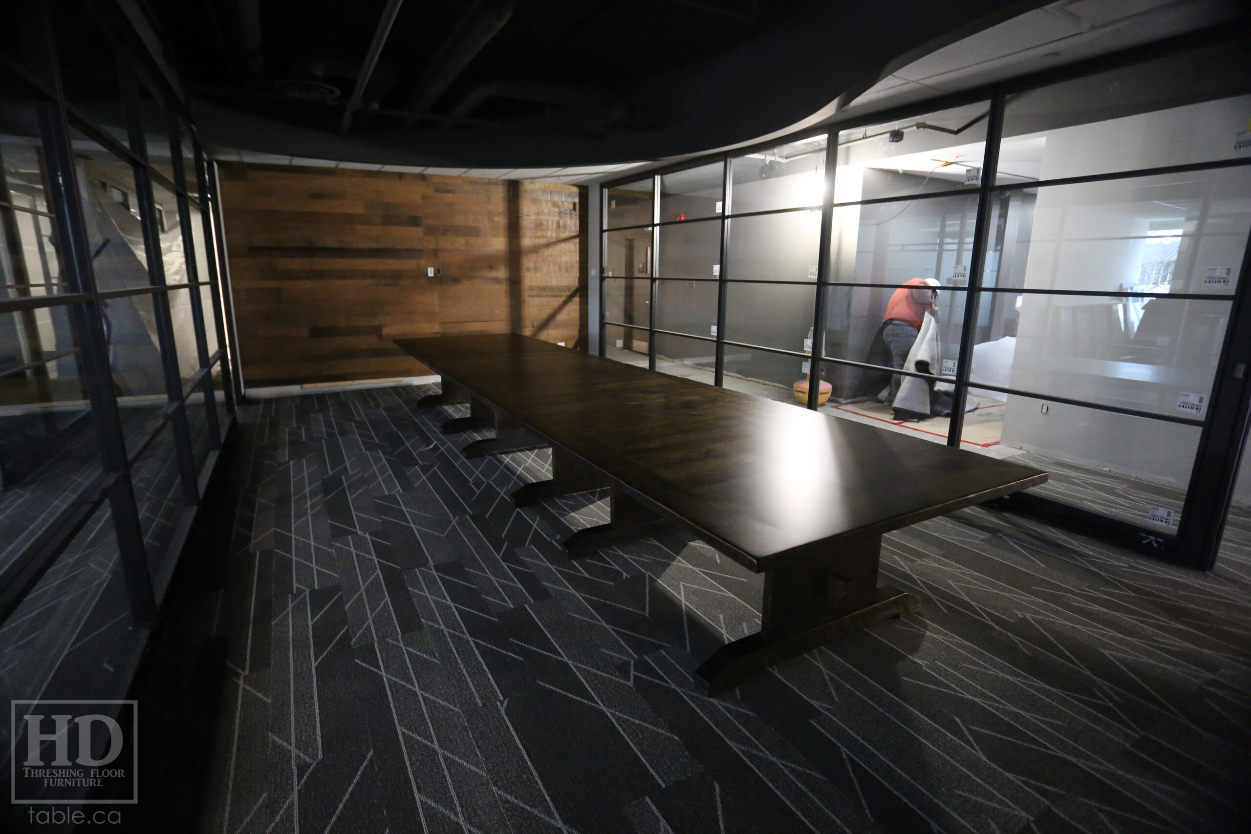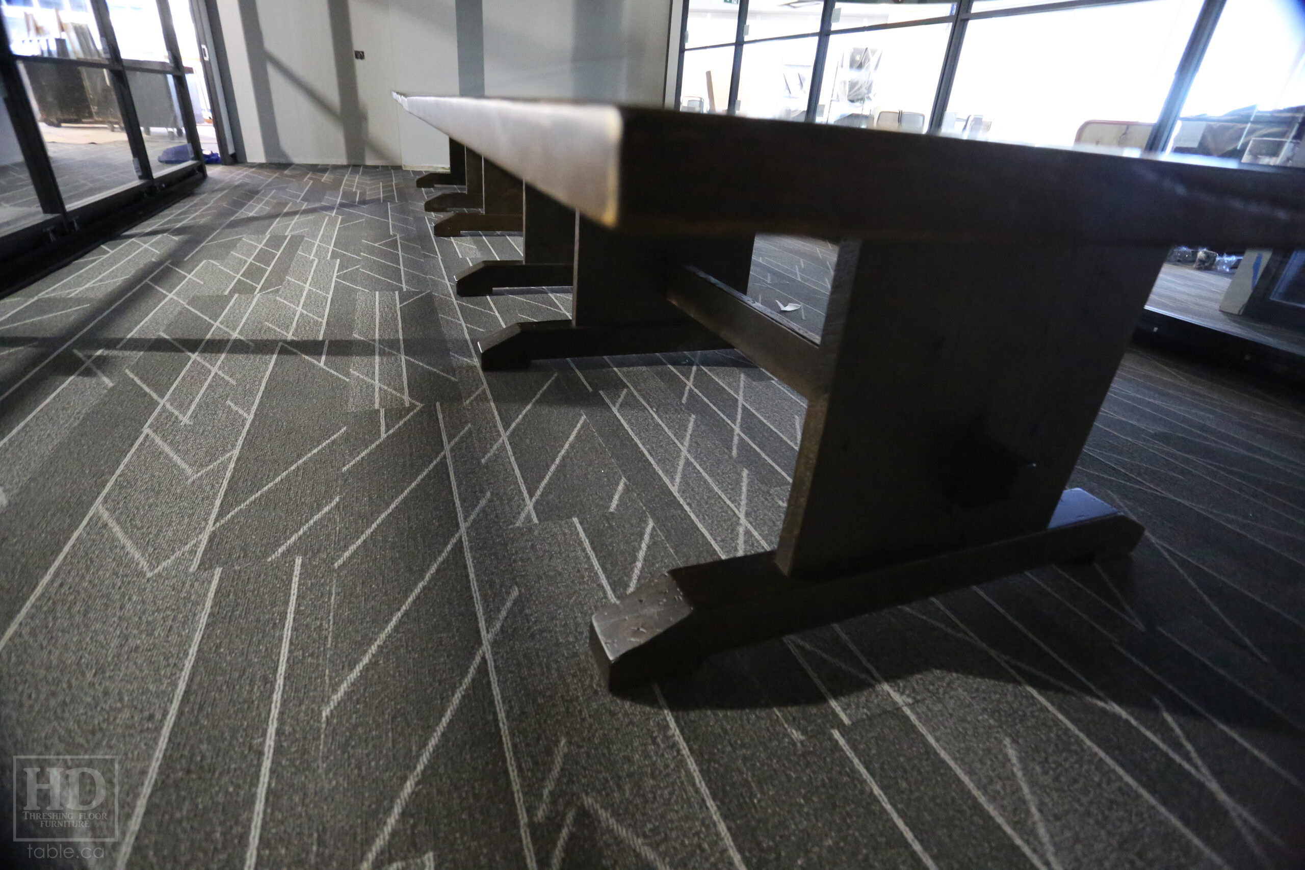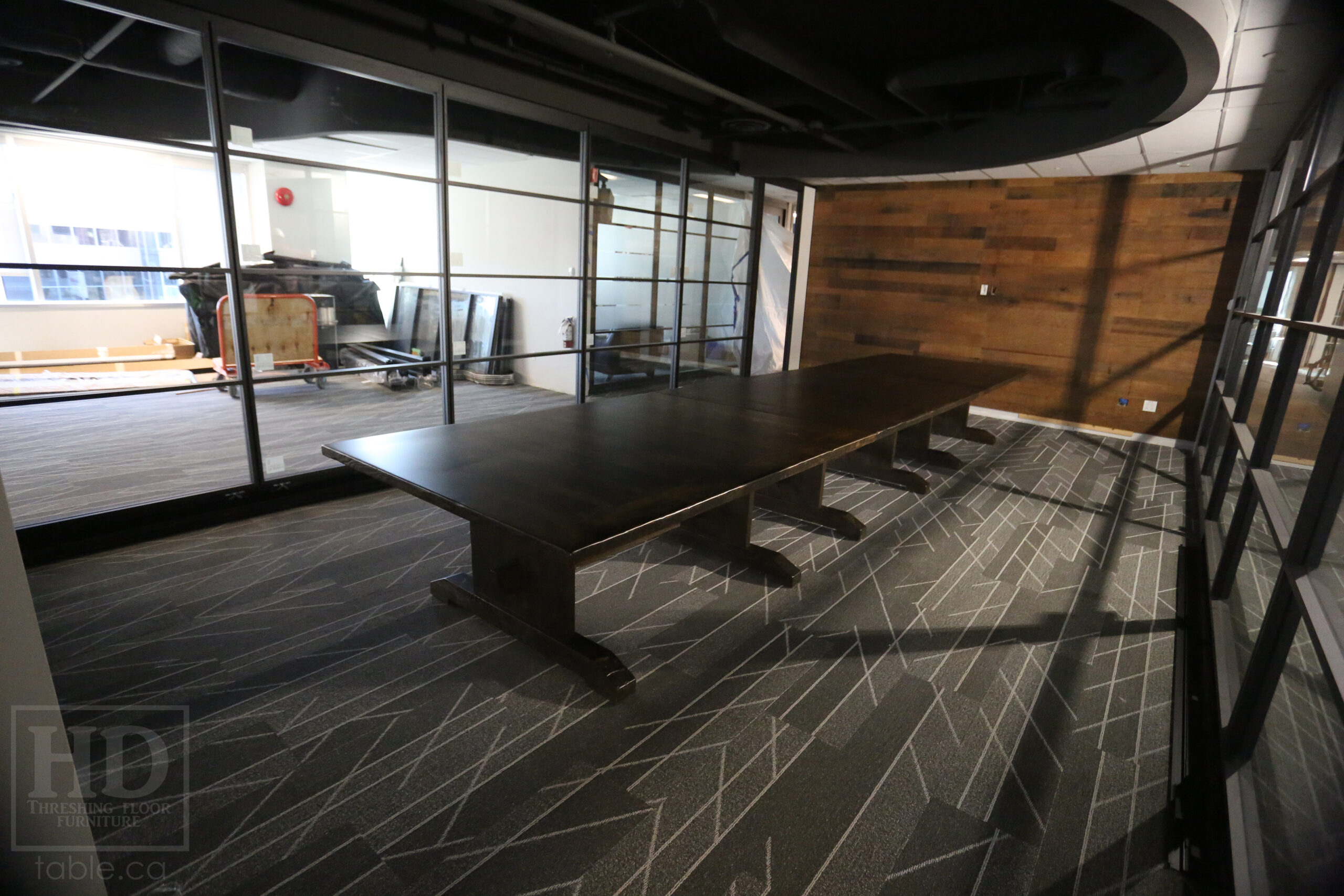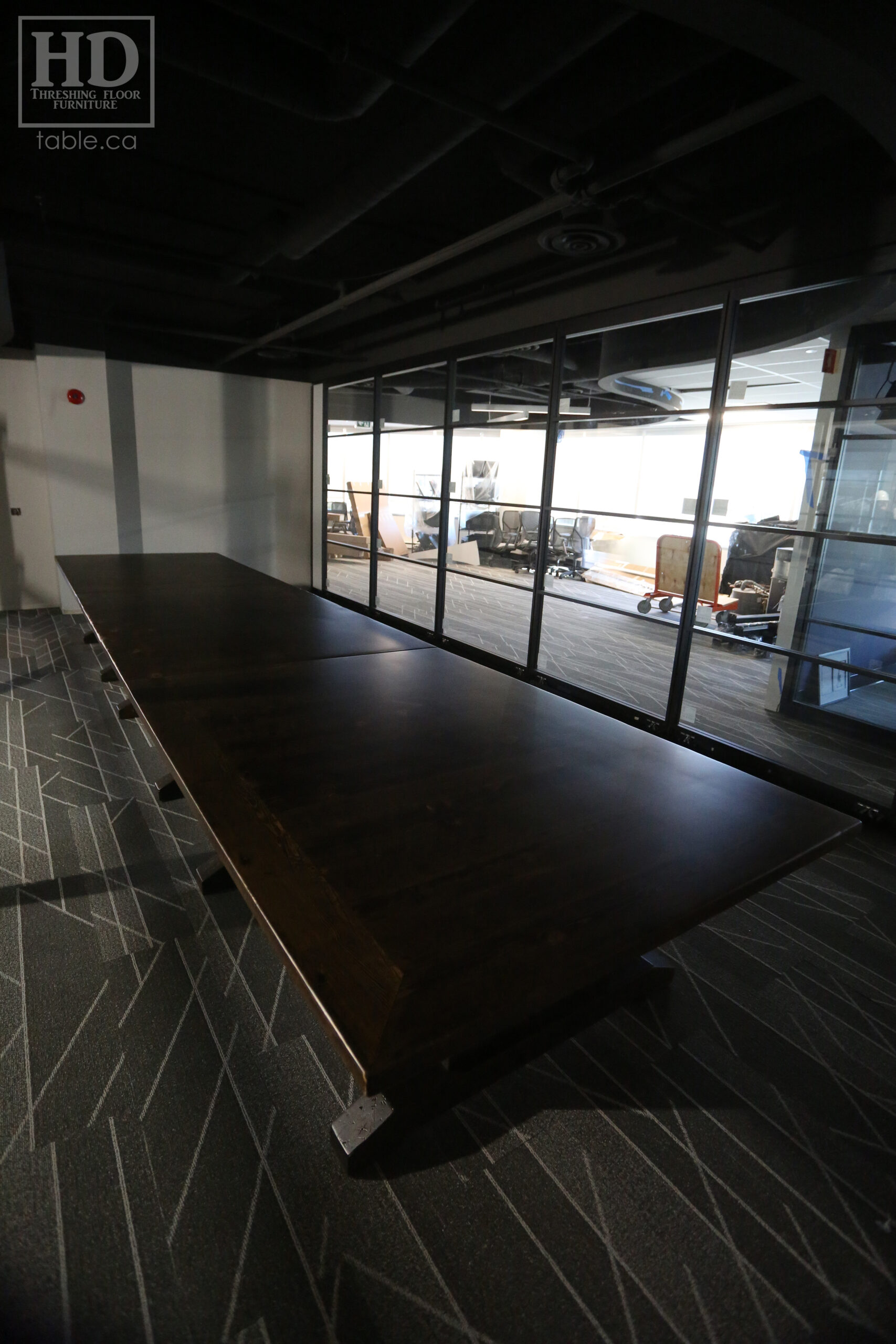 Project Summary: 21′ Ontario Barnwood Boardroom Table we made for an Ottawa Company – 60″ wide – Trestle Base – Old Growth Hemlock Threshing Floor Construction – Onsite final dowling 1/3 1/3 1/3 – 2 Posts Per 1/3 -Original edges & distressing maintained – Black Stain Option – Premium epoxy + matte polyurethane finish – www.table.ca