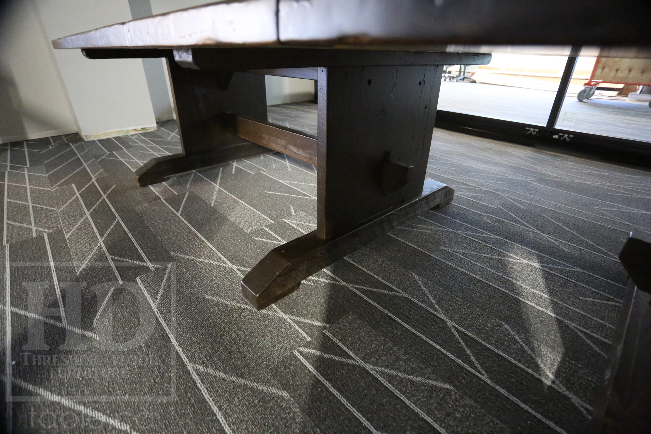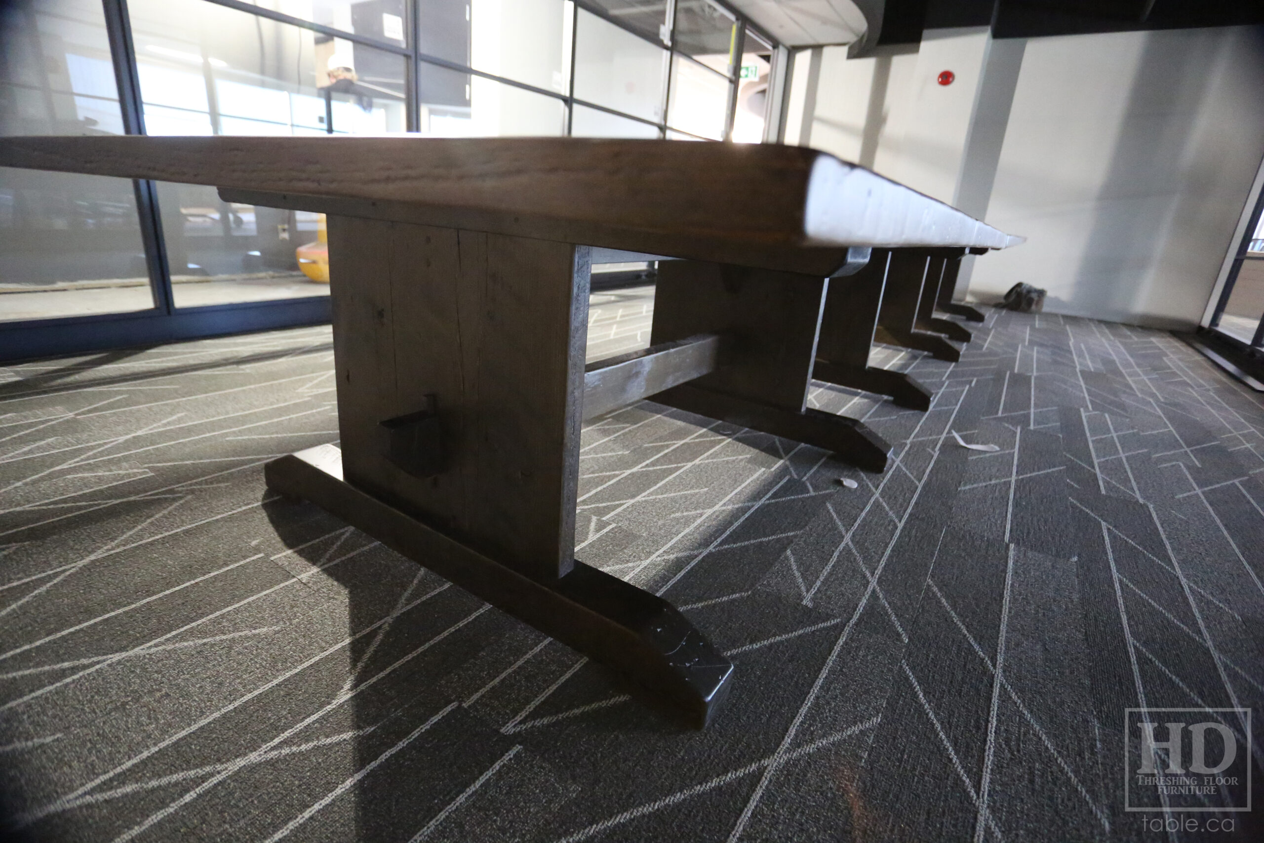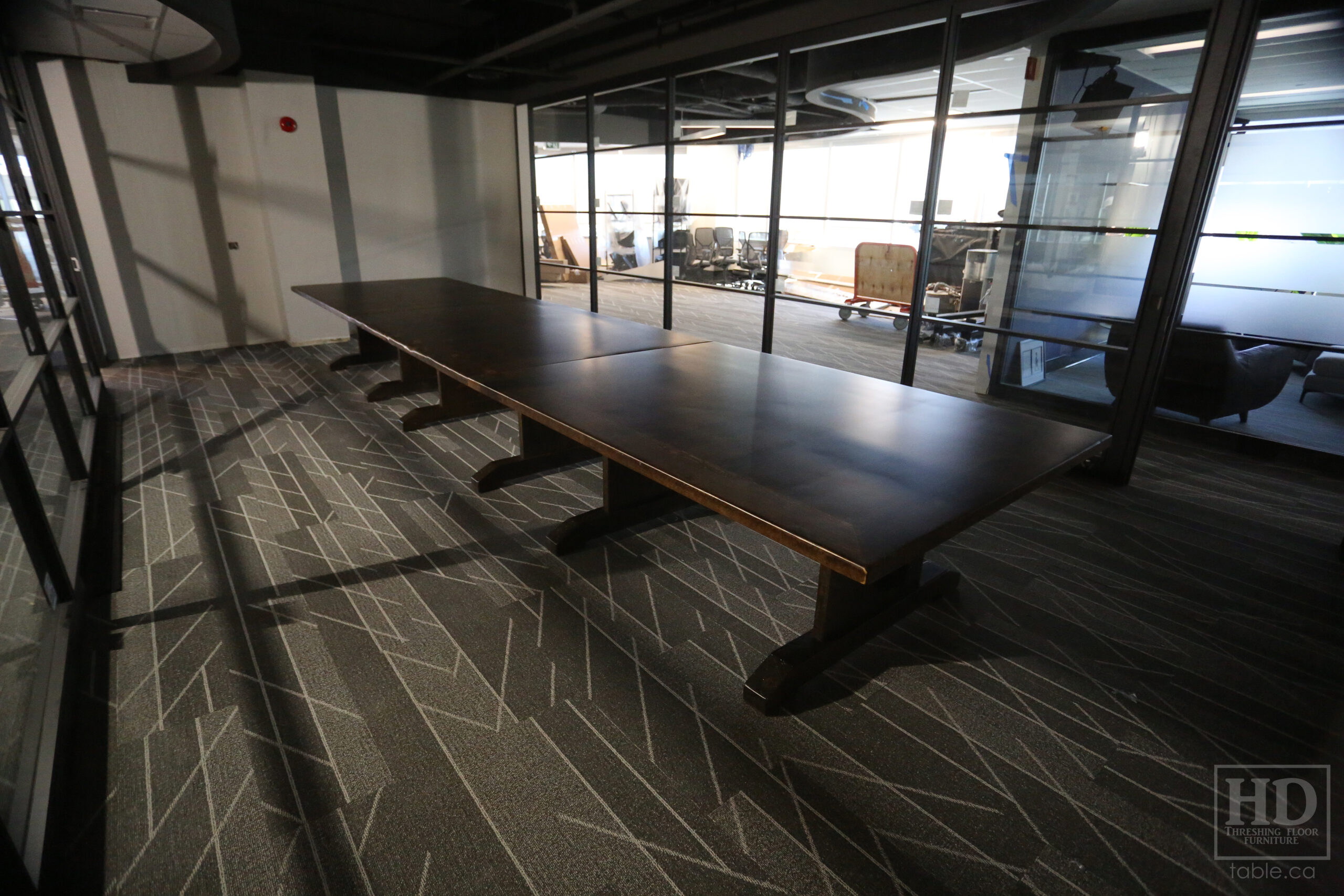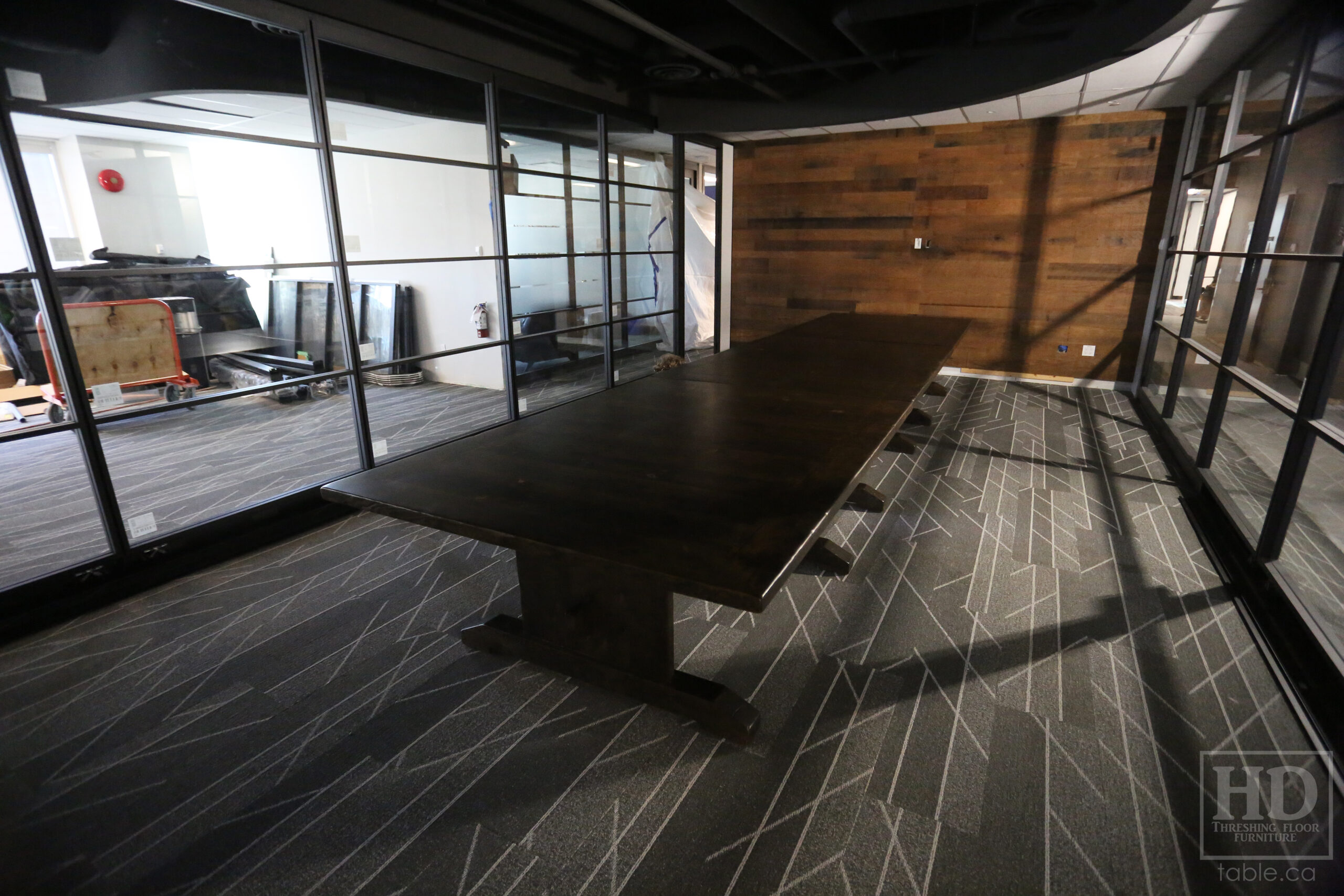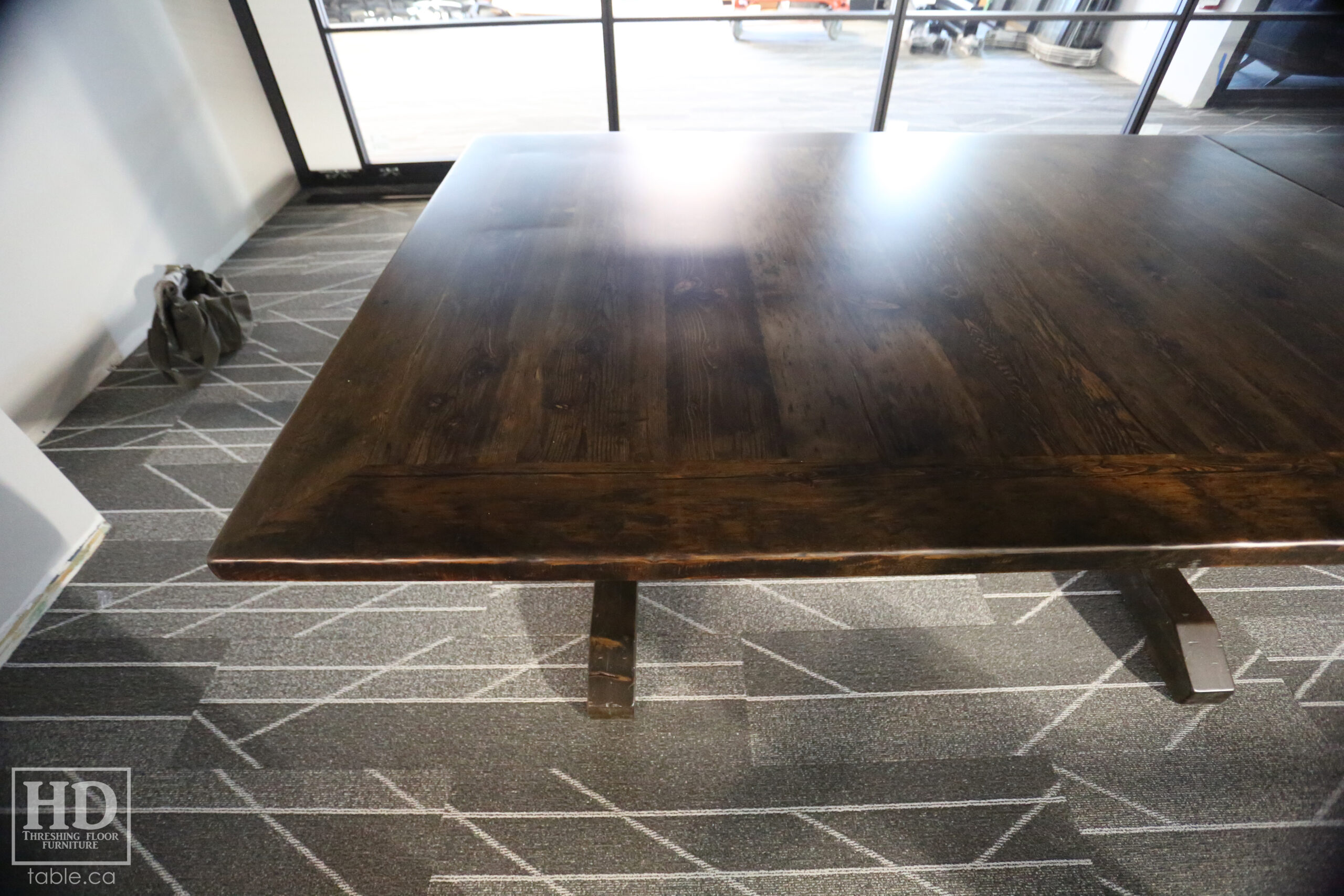 Project Summary: 21′ Ontario Barnwood Boardroom Table we made for an Ottawa Company – 60″ wide – Trestle Base – Old Growth Hemlock Threshing Floor Construction – Onsite final dowling 1/3 1/3 1/3 – 2 Posts Per 1/3 -Original edges & distressing maintained – Black Stain Option – Premium epoxy + matte polyurethane finish – www.table.ca
