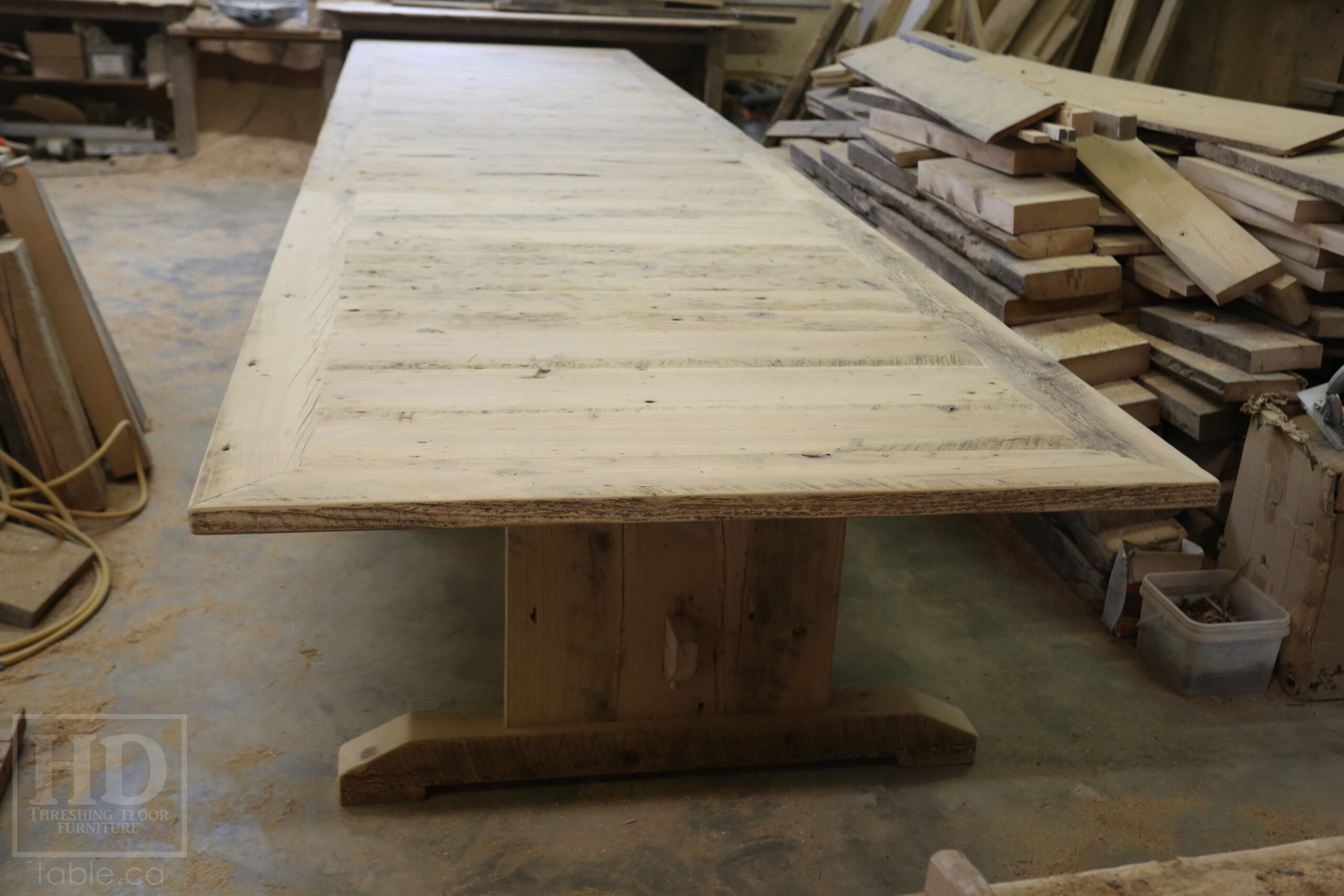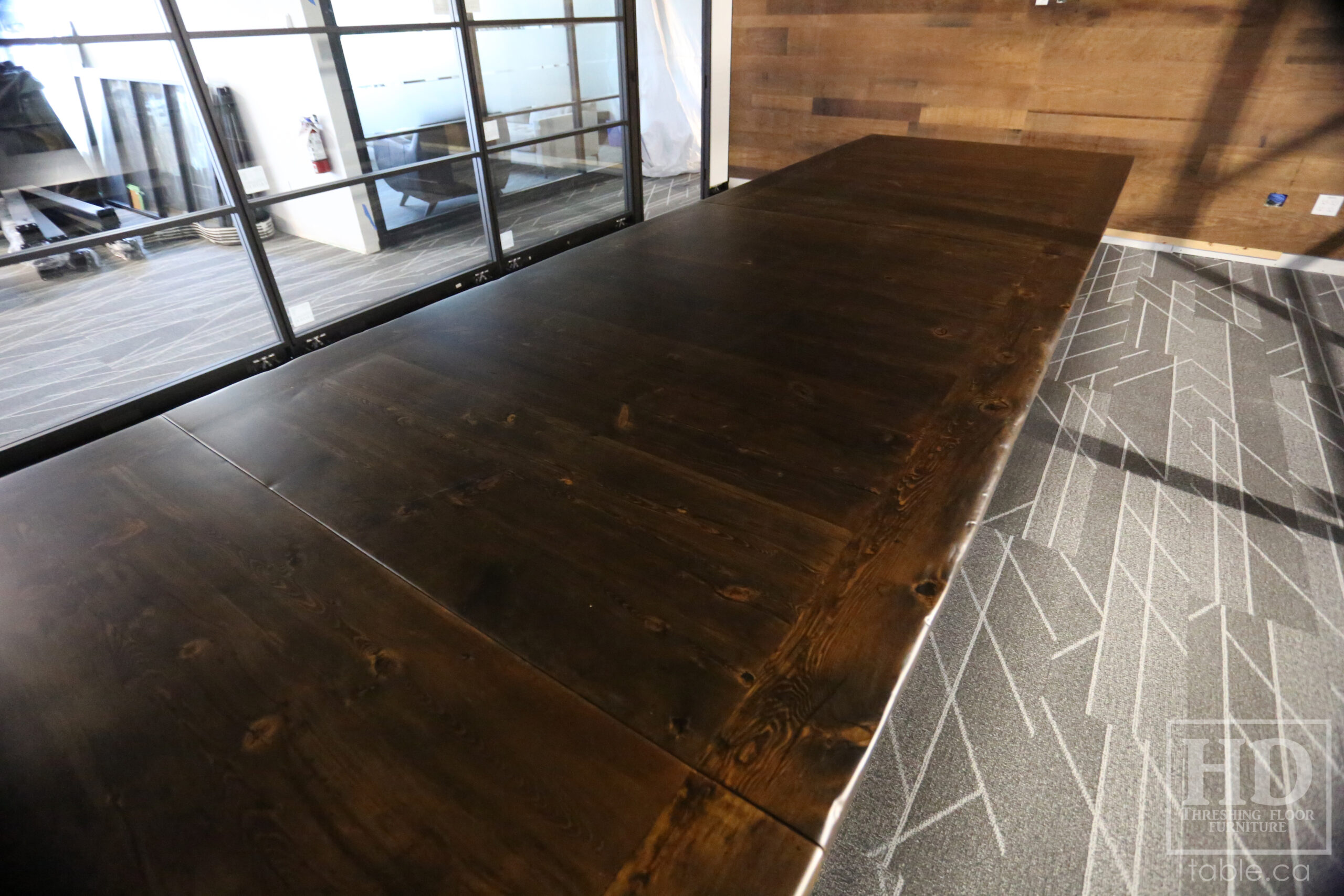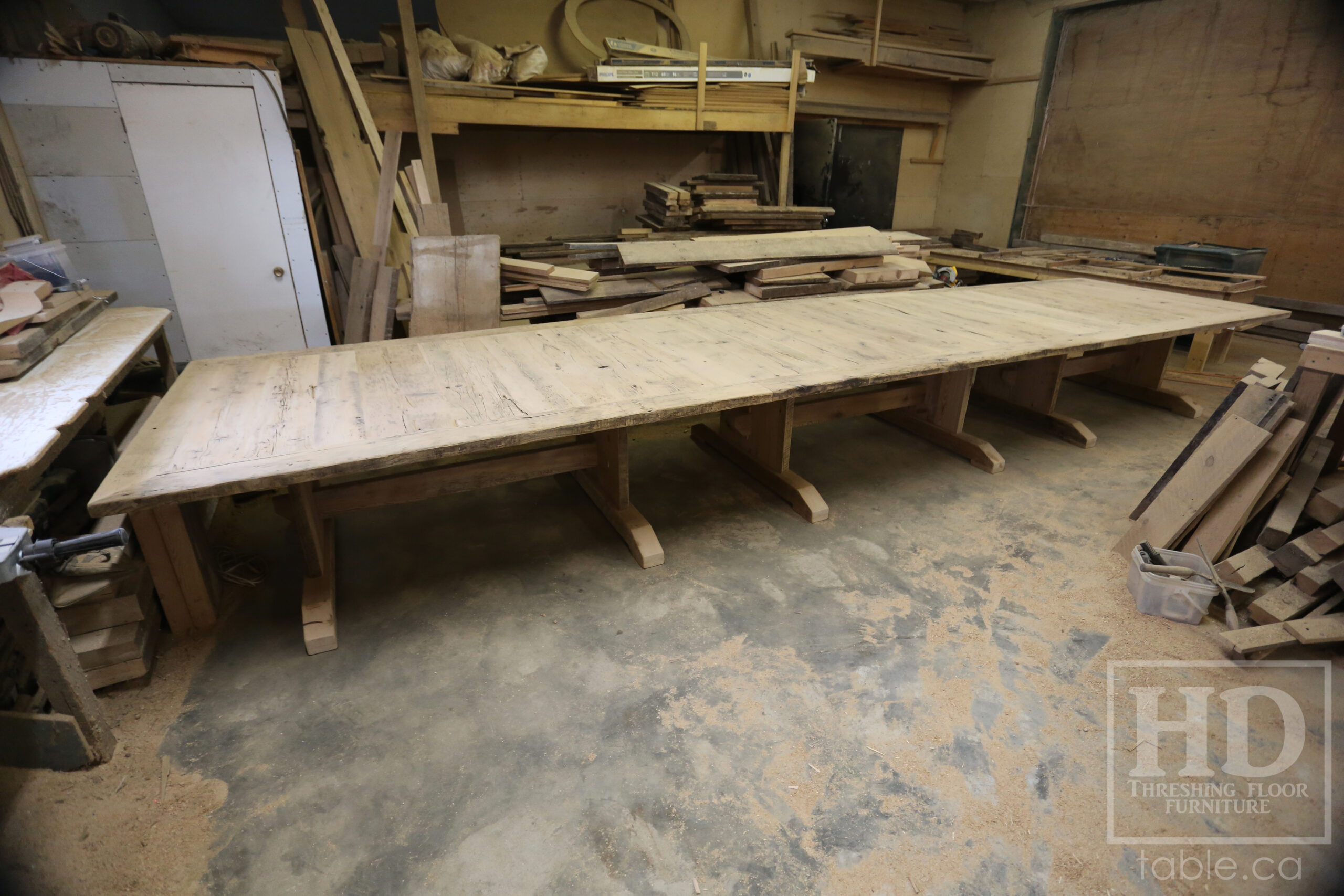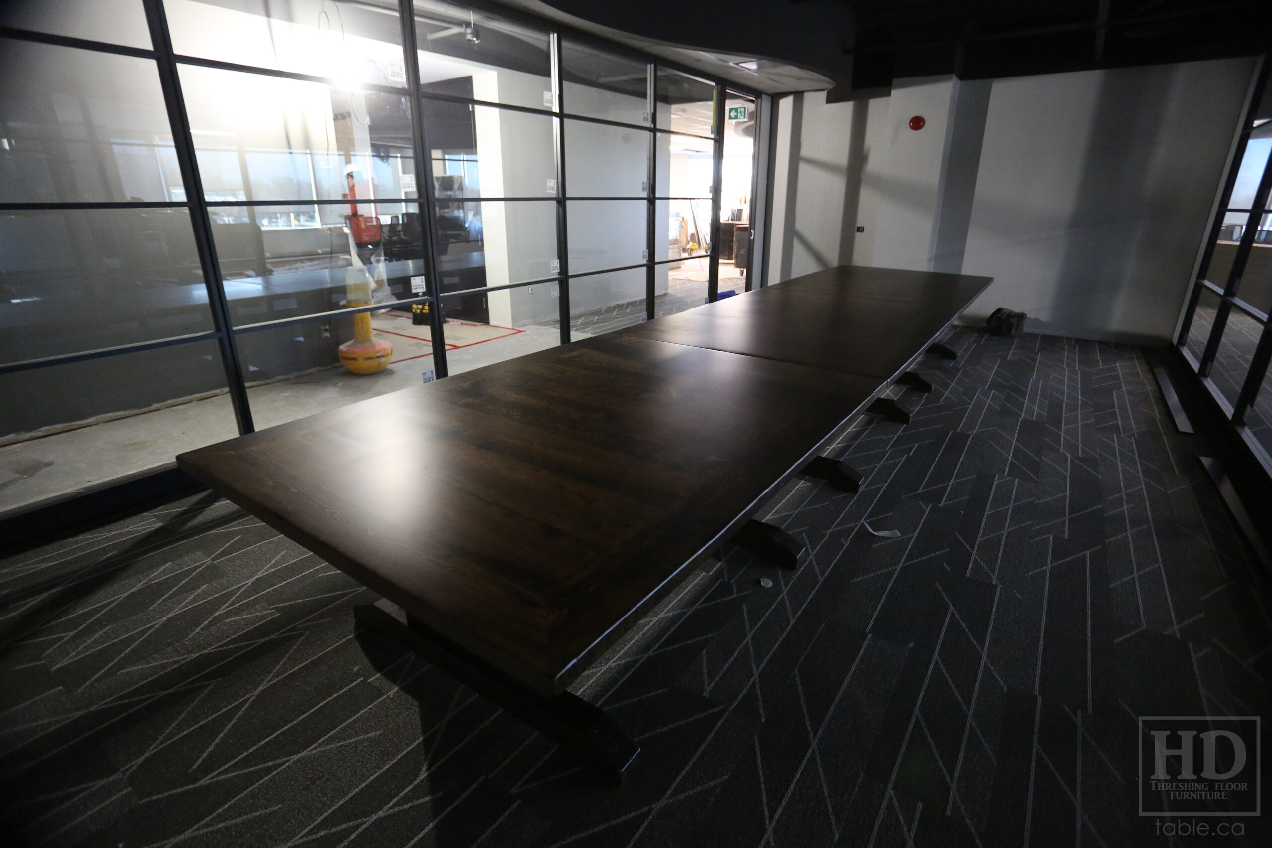 Project Summary: 21′ Ontario Barnwood Boardroom Table we made for an Ottawa Company – 60″ wide – Trestle Base – Old Growth Hemlock Threshing Floor Construction – Onsite final dowling 1/3 1/3 1/3 – 2 Posts Per 1/3 -Original edges & distressing maintained – Black Stain Option – Premium epoxy + matte polyurethane finish – www.table.ca