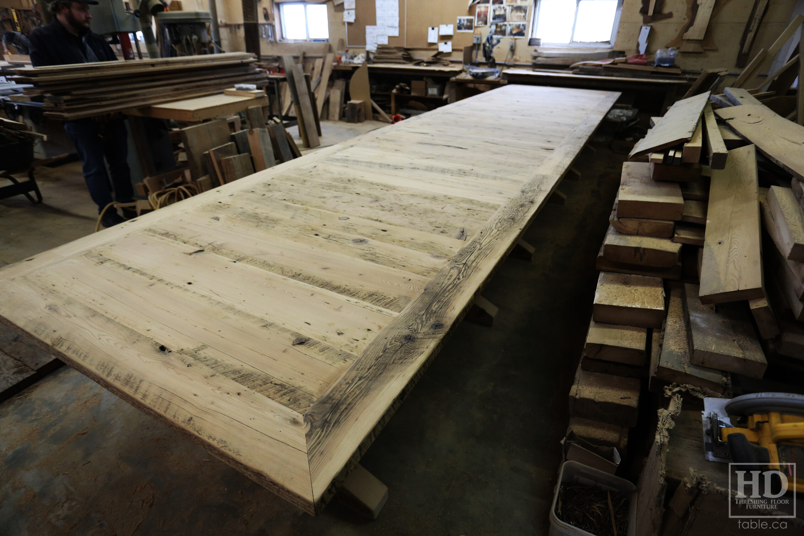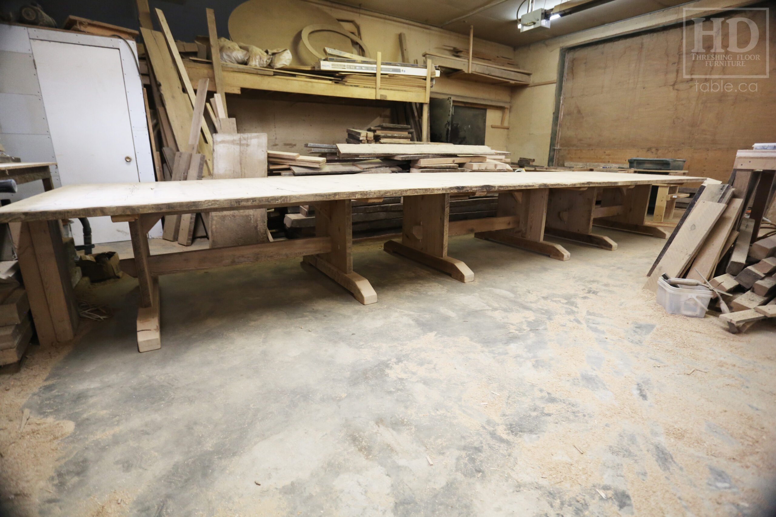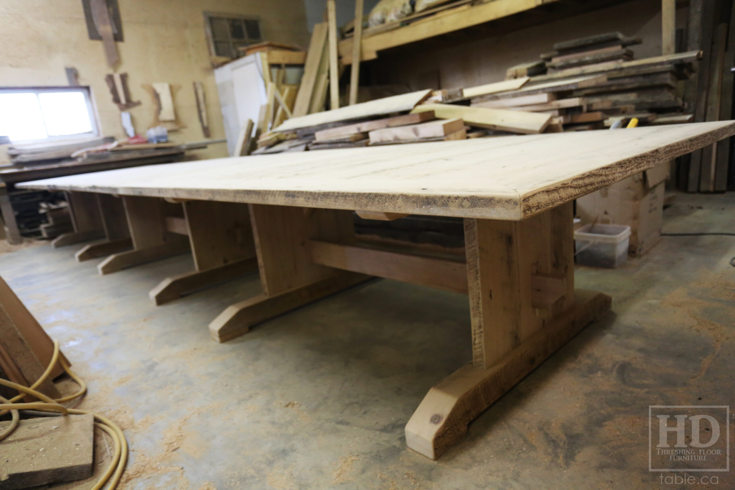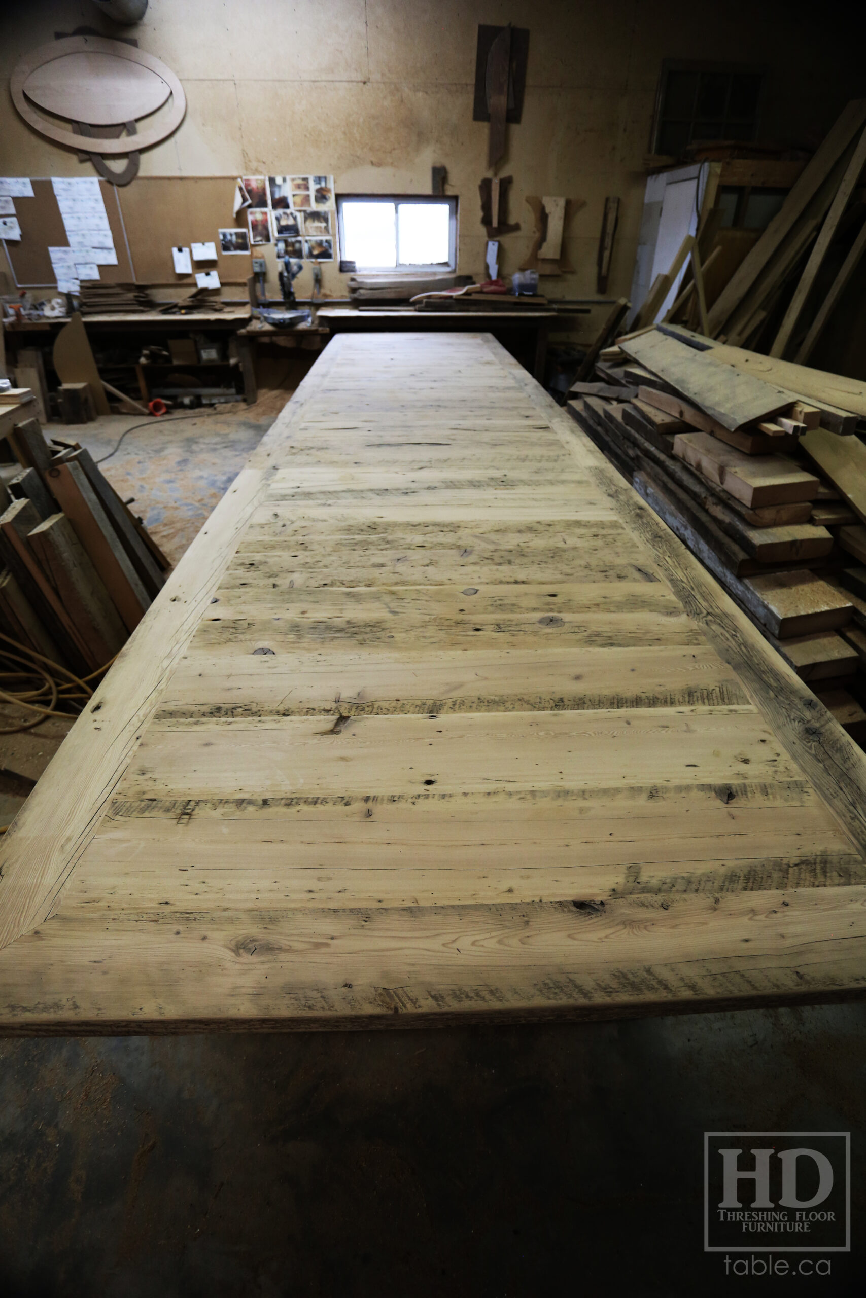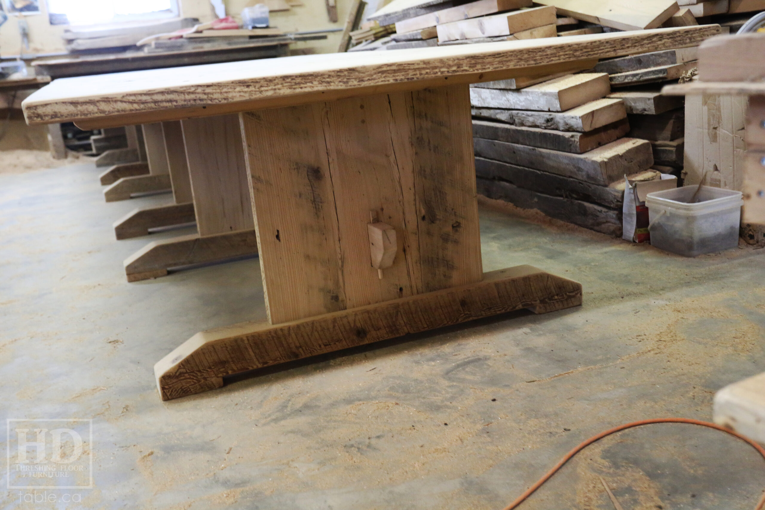 Project Summary: 21′ Ontario Barnwood Boardroom Table we made for an Ottawa Company – 60″ wide – Trestle Base – Old Growth Hemlock Threshing Floor Construction – Onsite final dowling 1/3 1/3 1/3 – 2 Posts Per 1/3 -Original edges & distressing maintained – Black Stain Option – Premium epoxy + matte polyurethane finish – www.table.ca