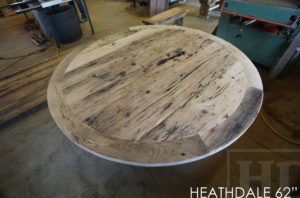 Details: 62″ Round Pedestal Table – Hand-Hewn Beam Post – Reclaimed Hemlock Threshing Floor Construction – Premium epoxy/matte polyurethane finish – Bleached/Greytone Treatment Finish Option