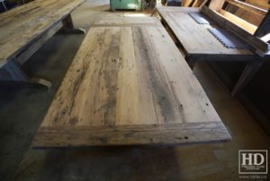 Description: Reclaimed Wood Furniture by HD Threshing Floor Furniture – Original distressing from Ontario pioneer living maintained – Custom built in-house locally – Barnwood Threshing Floor & Grainery Board Construction