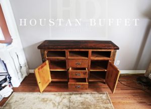 60″ Sideboard Multimedia Cabinet – 18″ deep – 36″ Counter Height – 1″ grainery board construction – 2″ Live edge top – Reclaimed Pine Barnwood – Internal 1″ Shelving – Premium epoxy/matte polyurethane finish – 3 doors – Lee Valley Antique Copper Hardware – 3 open spaces – 3 drawers