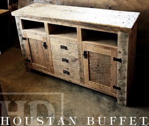 60″ Sideboard Multimedia Cabinet – 18″ deep – 36″ Counter Height – 1″ grainery board construction – 2″ Live edge top – Reclaimed Pine Barnwood – Internal 1″ Shelving – Premium epoxy/matte polyurethane finish – 3 doors – Lee Valley Antique Copper Hardware – 3 open spaces – 3 drawers