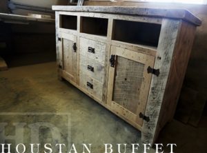60″ Sideboard Multimedia Cabinet – 18″ deep – 36″ Counter Height – 1″ grainery board construction – 2″ Live edge top – Reclaimed Pine Barnwood – Internal 1″ Shelving – Premium epoxy/matte polyurethane finish – 3 doors – Lee Valley Antique Copper Hardware – 3 open spaces – 3 drawers