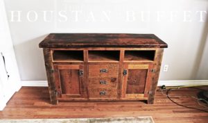 60″ Sideboard Multimedia Cabinet – 18″ deep – 36″ Counter Height – 1″ grainery board construction – 2″ Live edge top – Reclaimed Pine Barnwood – Internal 1″ Shelving – Premium epoxy/matte polyurethane finish – 3 doors – Lee Valley Antique Copper Hardware – 3 open spaces – 3 drawers