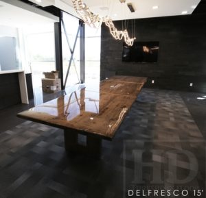 Details: 15 ft Boardroom Table – 48″ wide – 3″ Plank Joists Base with Centre Cavity – Reclaimed Hemlock Barnwood Construction – 2″ Top with Original Barnwood Edges Maintained – Custom Logo Embedded – Greytone Treatment to Preserve Tones of Unfinished – Premium epoxy/high gloss polyurethane finish – Dry On-Site Final Doweling [delivered in three 5′ sections]
