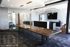 Details: 15 ft Boardroom Table – 48″ wide – 3″ Plank Joists Base with Centre Cavity – Reclaimed Hemlock Barnwood Construction – 2″ Top with Original Barnwood Edges Maintained – Custom Logo Embedded – Greytone Treatment to Preserve Tones of Unfinished – Premium epoxy/high gloss polyurethane finish – Dry On-Site Final Doweling [delivered in three 5′ sections]