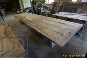 Details: 15 ft Boardroom Table – 48″ wide – 3″ Plank Joists Base with Centre Cavity – Reclaimed Hemlock Barnwood Construction – 2″ Top with Original Barnwood Edges Maintained – Custom Logo Embedded – Greytone Treatment to Preserve Tones of Unfinished – Premium epoxy/high gloss polyurethane finish – Dry On-Site Final Doweling [delivered in three 5′ sections]