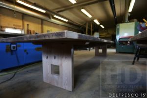 Details: 15 ft Boardroom Table – 48″ wide – 3″ Plank Joists Base with Centre Cavity – Reclaimed Hemlock Barnwood Construction – 2″ Top with Original Barnwood Edges Maintained – Custom Logo Embedded – Greytone Treatment to Preserve Tones of Unfinished – Premium epoxy/high gloss polyurethane finish – Dry On-Site Final Doweling [delivered in three 5′ sections]