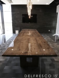Details: 15 ft Boardroom Table – 48″ wide – 3″ Plank Joists Base with Centre Cavity – Reclaimed Hemlock Barnwood Construction – 2″ Top with Original Barnwood Edges Maintained – Custom Logo Embedded – Greytone Treatment to Preserve Tones of Unfinished – Premium epoxy/high gloss polyurethane finish – Dry On-Site Final Doweling [delivered in three 5′ sections]