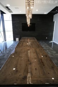 Details: 15 ft Boardroom Table – 48″ wide – 3″ Plank Joists Base with Centre Cavity – Reclaimed Hemlock Barnwood Construction – 2″ Top with Original Barnwood Edges Maintained – Custom Logo Embedded – Greytone Treatment to Preserve Tones of Unfinished – Premium epoxy/high gloss polyurethane finish – Dry On-Site Final Doweling [delivered in three 5′ sections]