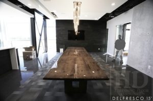 Details: 15 ft Boardroom Table – 48″ wide – 3″ Plank Joists Base with Centre Cavity – Reclaimed Hemlock Barnwood Construction – 2″ Top with Original Barnwood Edges Maintained – Custom Logo Embedded – Greytone Treatment to Preserve Tones of Unfinished – Premium epoxy/high gloss polyurethane finish – Dry On-Site Final Doweling [delivered in three 5′ sections]