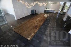 Details: 15 ft Boardroom Table – 48″ wide – 3″ Plank Joists Base with Centre Cavity – Reclaimed Hemlock Barnwood Construction – 2″ Top with Original Barnwood Edges Maintained – Custom Logo Embedded – Greytone Treatment to Preserve Tones of Unfinished – Premium epoxy/high gloss polyurethane finish – Dry On-Site Final Doweling [delivered in three 5′ sections]