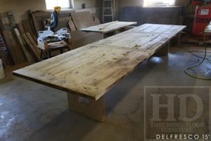 Details: 15 ft Boardroom Table – 48″ wide – 3″ Plank Joists Base with Centre Cavity – Reclaimed Hemlock Barnwood Construction – 2″ Top with Original Barnwood Edges Maintained – Custom Logo Embedded – Greytone Treatment to Preserve Tones of Unfinished – Premium epoxy/high gloss polyurethane finish – Dry On-Site Final Doweling [delivered in three 5′ sections]