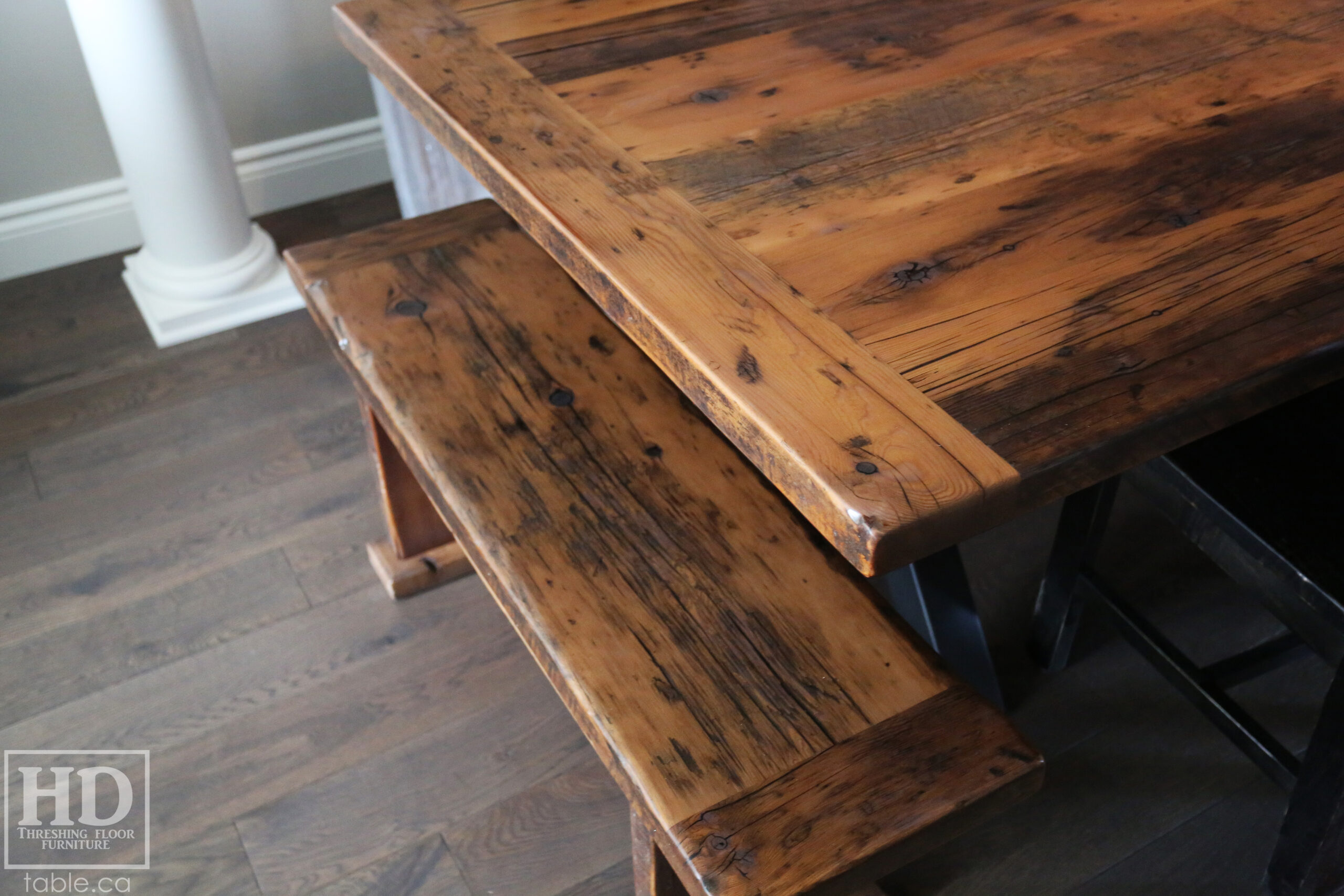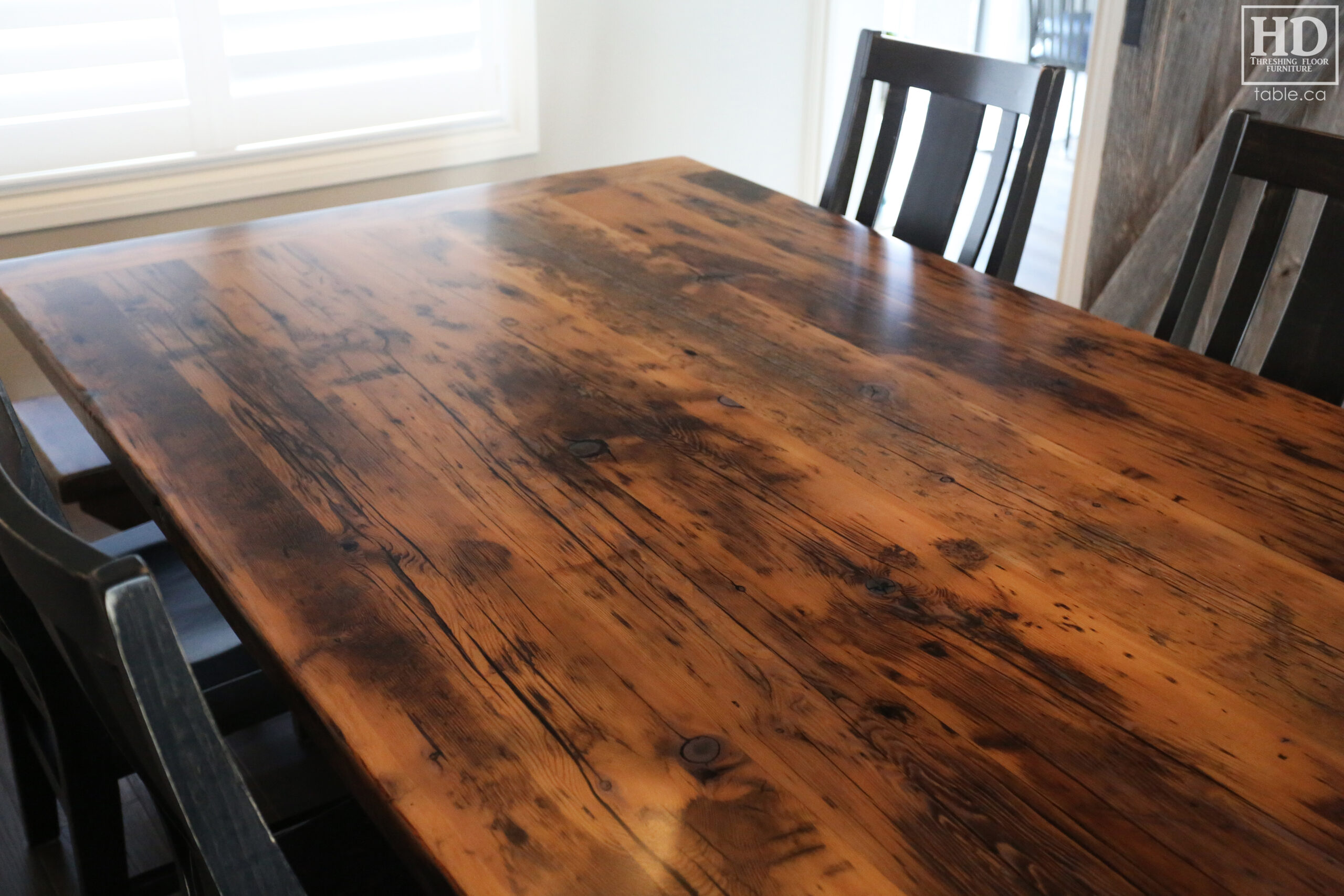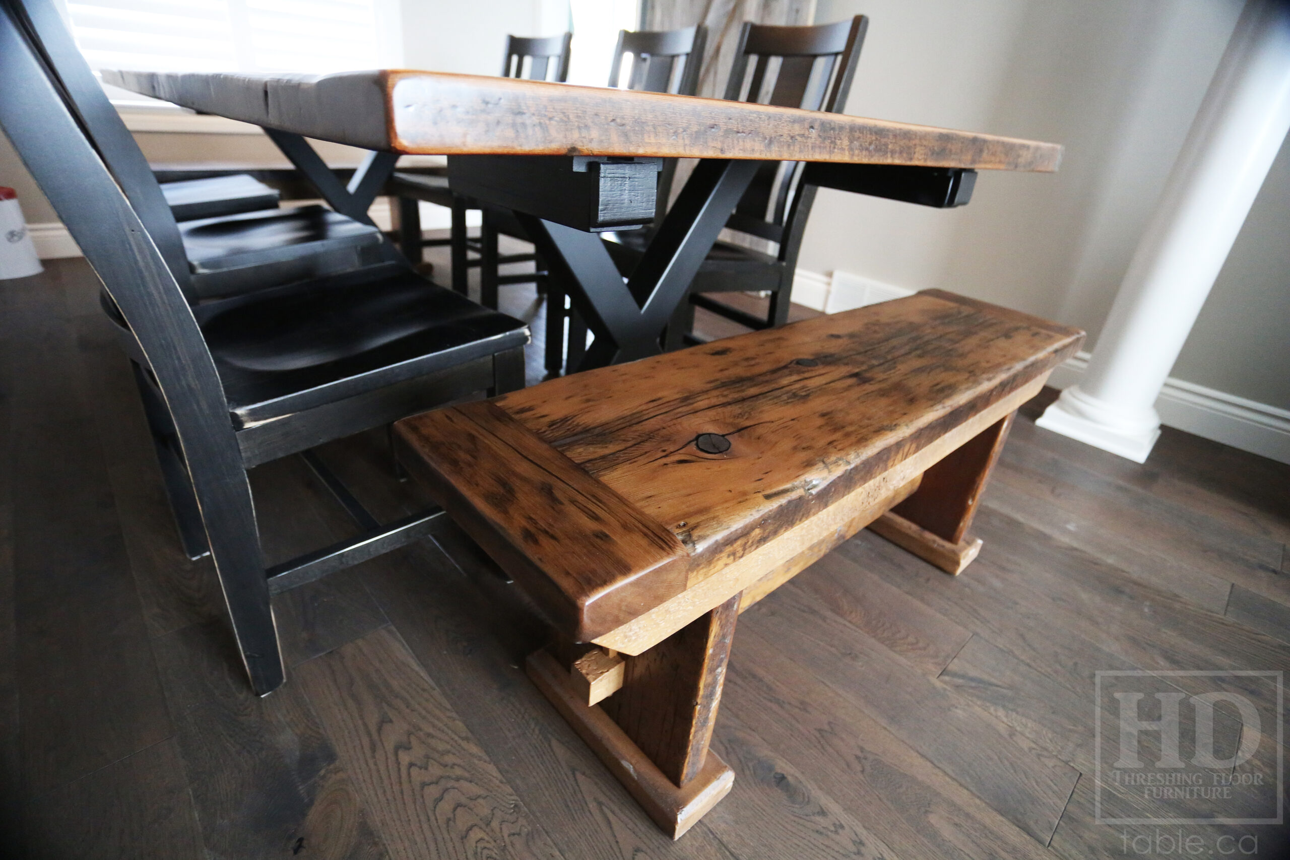 Project summary: 8’ Ontario Barnwood Table we made for a Dorchester, Ontario home – Matte Black X Shaped Metal Base – Old Growth Hemlock Threshing Floor Construction – Original distressing & edges maintained – Premium epoxy + satin polyurethane finish – Two 18†Leaf Extensions – [2] Matching 46†Trestle Benches – 6 Sorority Chairs / Wormy Maple / Pained Black with Sandthroughs / Polyurethane clearcoat finish / www.table.ca