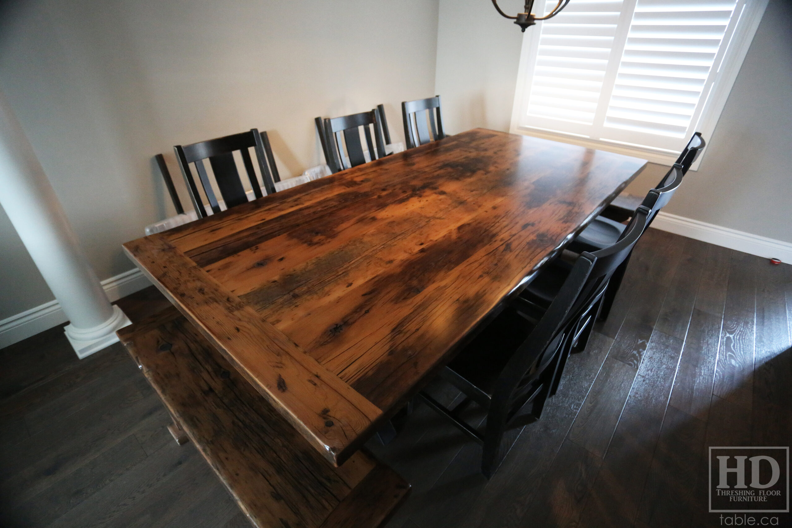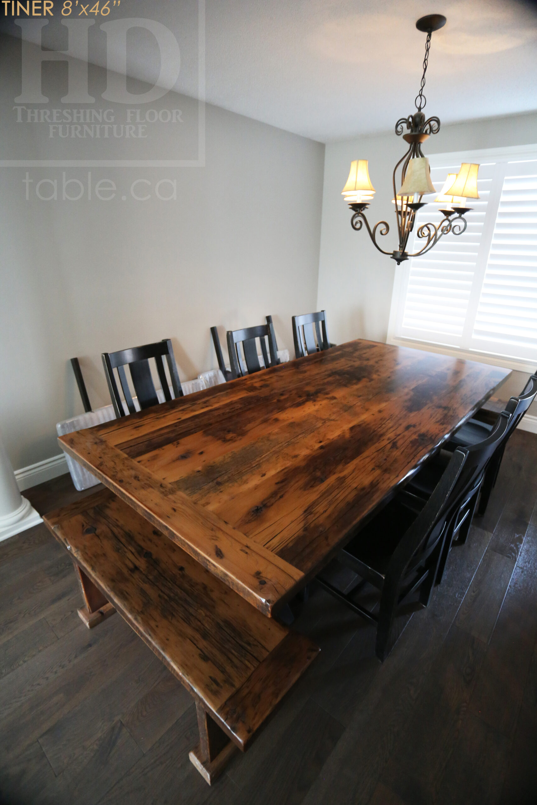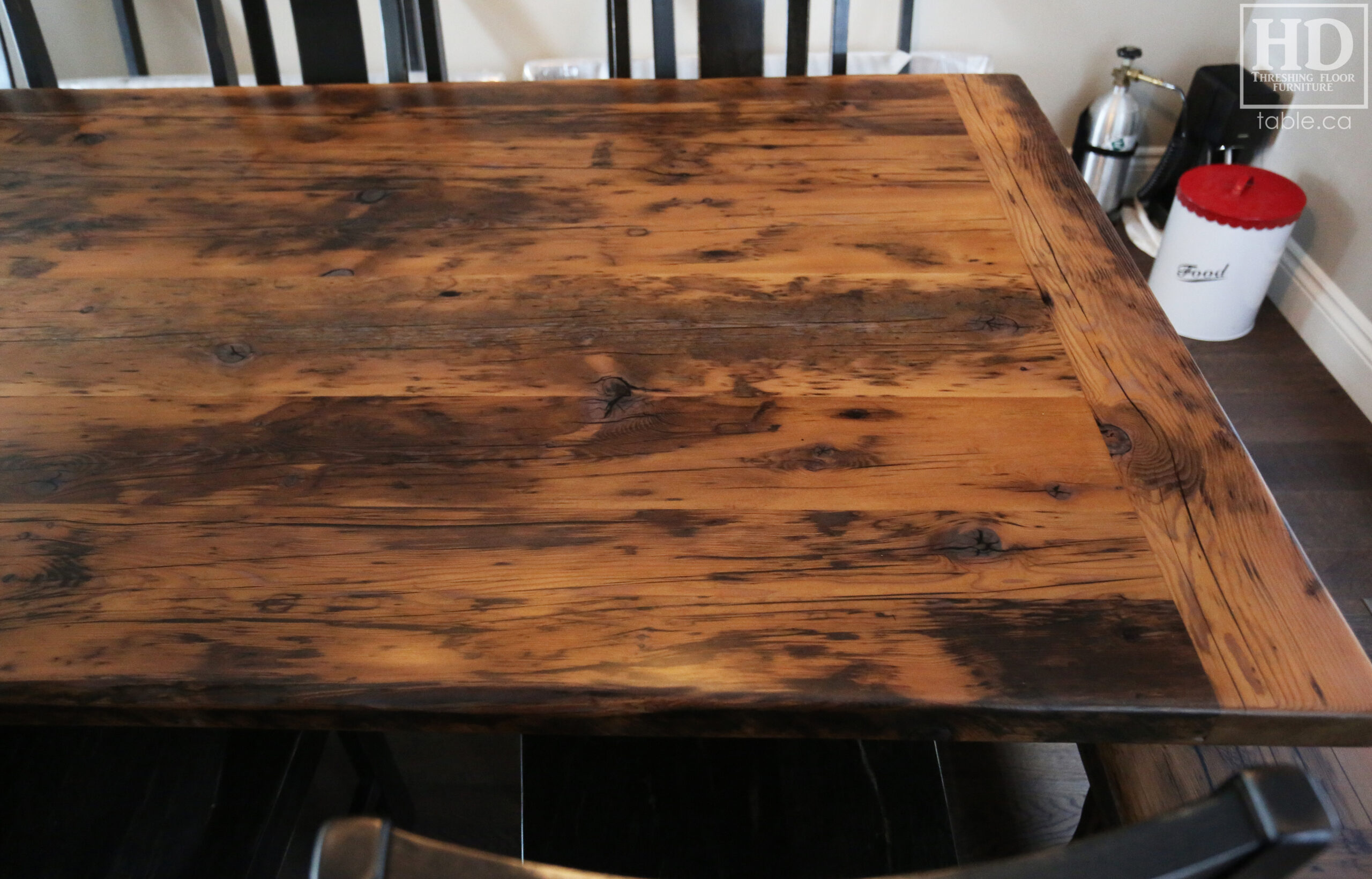 Project summary: 8’ Ontario Barnwood Table we made for a Dorchester, Ontario home – Matte Black X Shaped Metal Base – Old Growth Hemlock Threshing Floor Construction – Original distressing & edges maintained – Premium epoxy + satin polyurethane finish – Two 18†Leaf Extensions – [2] Matching 46†Trestle Benches – 6 Sorority Chairs / Wormy Maple / Pained Black with Sandthroughs / Polyurethane clearcoat finish / www.table.ca