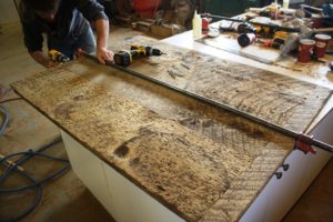 Description: 5′ Reclaimed Wood Island – 36″ [Counter] Height – Bottom 1″ Grainery Board Shelf – 4″x4′ Windbrace Beam Legs – 12″ overhang – 2″ Threshing Floor Hemlock Construction – Breadedge Ends – 4.5″+- Skirting – Drawer In End