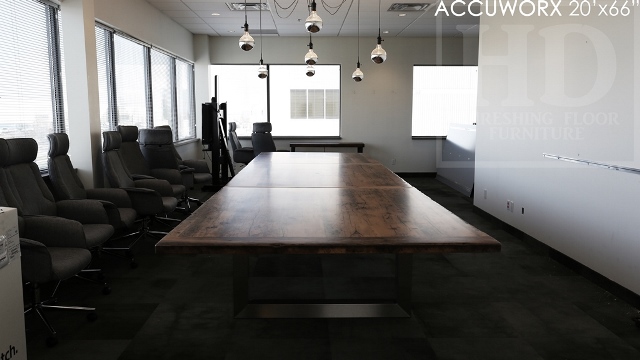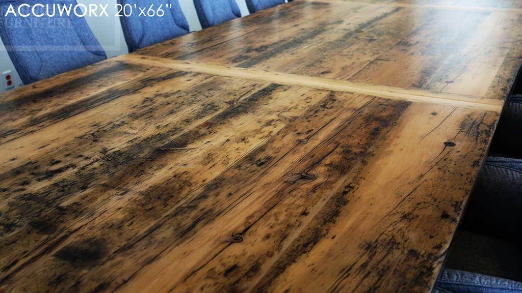 All our reclaimed wood boardroom tables are custom built to any size; even large sizes. Our epoxy finish allows us to keep almost all the original distressing; while making the top practical and durable for everyday use. Check out this 20′ boardroom table we made for the Mississauga company Accuworx: