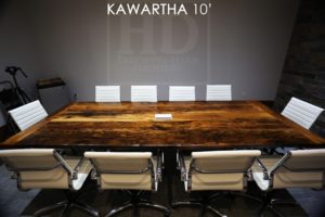 Description: 10 ft Boardroom Table – 48″ wide – Solid Reclaimed Hemlock Threshing Floor Construction – Premium epoxy/satin polyurethane finish – Stainless Steel Metal Base – Original Barn Floor Board Edges MaintainedÂÂ