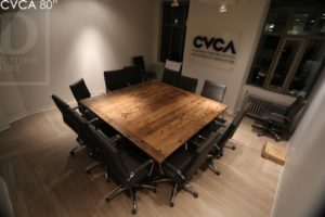 Description: 80″ x 80″ Custom Boardroom Table – Plank Style Base – Reclaimed Hemlock Threshing Floor Construction – Premium epoxy/polyurethane finish – Greytone Treatment to Preserve Tones of Unfinished – Original Barnwood Distressing MaintainedÂÂ