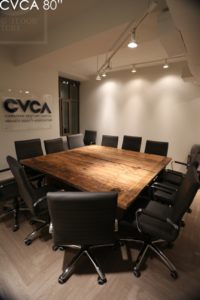 Description: 80″ x 80″ Custom Boardroom Table – Plank Style Base – Reclaimed Hemlock Threshing Floor Construction – Premium epoxy/polyurethane finish – Greytone Treatment to Preserve Tones of Unfinished – Original Barnwood Distressing MaintainedÂÂ