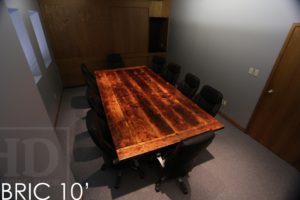 Details: 10 ft Boardroom Table – 60″ wide – 2″ Threshing Floor Top – Reclaimed Hemlock Threshing Floor Construction – Premium epoxy/polyurethane finish – Hand-Hewn Beam Pedestals Base – Original barnwood edges maintained
