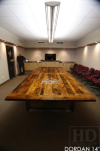 Specs: 14 foot Boardroom Conference Table – 6 feet wide – Reclaimed Hemlock Threshing Floor 2″ Top – Premium epoxy/polyurethane finish – Centre doweling on site – Stainless Steel Base – Original distressing maintained – Raw barn floor board edges kept – Custom logo graphic laser cut out of steel and embedded in table top [2x]Â