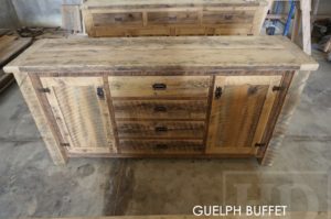 Description: 6 ft Buffet – 18″ deep – 36″ height – Reclaimed Hemlock Threshing Floor Construction – Premium epoxy/polyurethane finish – 4 drawers / 2 doors – Adjustable internal shelving – Original distressing/edges maintained – Lee Valley Hardware