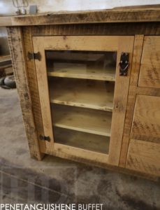 Details: 6 ft Buffet – 18″ deep – 36″ height – 3 Centre Drawers – Two Outside Doors with Glass – Barnwood Hemlock Threshing Floor 2″ Top – – 1′ Grainery Board Construction Base – Lee Valley Hardware – Original reclaimed wood edges/distressing kept