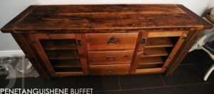 Details: 6 ft Buffet – 18″ deep – 36″ height – 3 Centre Drawers – Two Outside Doors with Glass – Barnwood Hemlock Threshing Floor 2″ Top – – 1′ Grainery Board Construction Base – Lee Valley Hardware – Original reclaimed wood edges/distressing kept