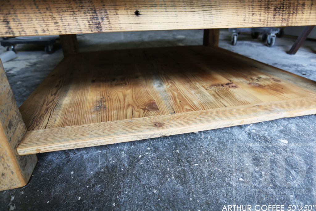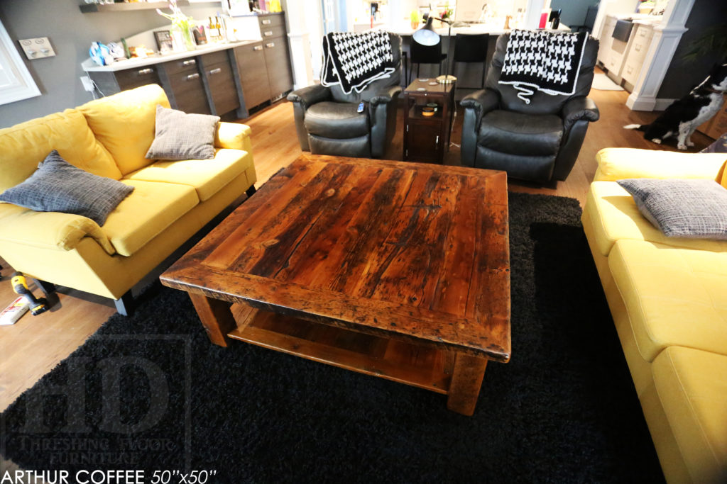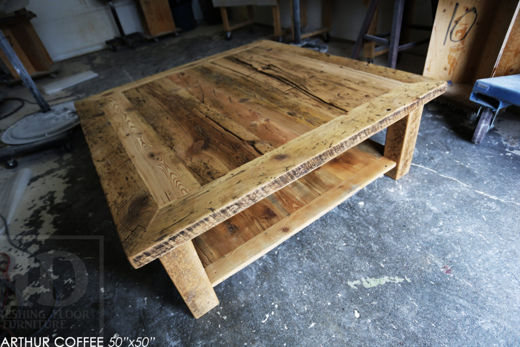 ![50" x 50" Coffee Table - 18" height - Hemlock Threshing Floor 2" Top - 4"x4" Windbrace Beam Legs - Bottom 1" Grainery Board Shelf - Original edges & distressing maintained - Premium [light coating option] epoxy + matte polyurethane finish - www.hdthreshing.dreamhosters.com/blog](https://www.hdthreshing.dreamhosters.com/blog/blog/wp-content/uploads/2020/05/RE09941-1024x683.jpg)