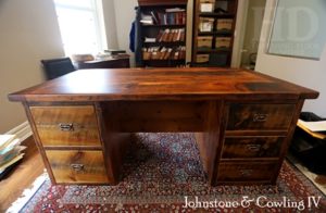 Description: 6 ft Reclaimed Wood Desk – 36″ deep – Threshing Floor Wall Drawer Boxes – 2 drawers on left side / 3 drawers on right side – Solid Hemlock Threshing Floor Boards Construction – Lee Valley Hardware – Premium epoxy/satin polyurethane finish – Original barn floor board distressing maintained