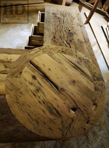 Details: 77″ Long Desk – 66″ return – 90 degree corner with integrated 30″ round top – 3 drawers – Reclaimed Threshing Floor Pine – Premium epoxy/matte polyurethane finish