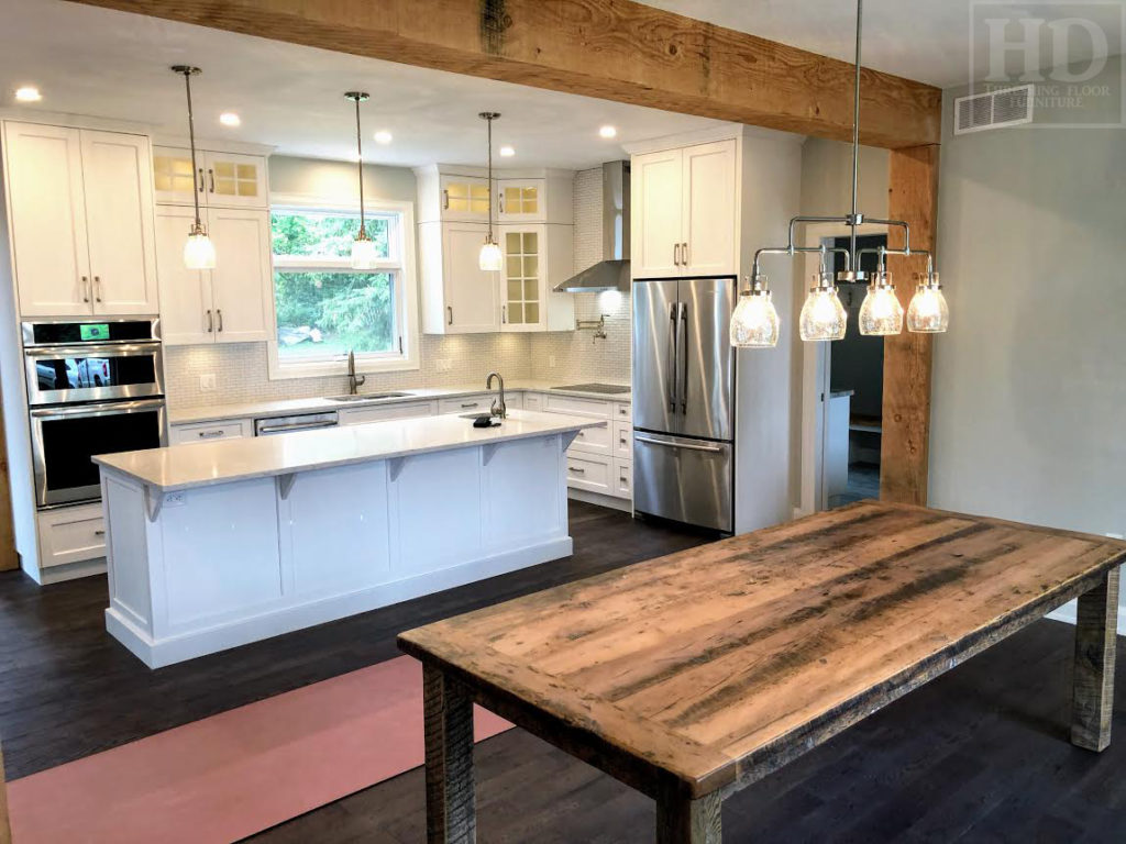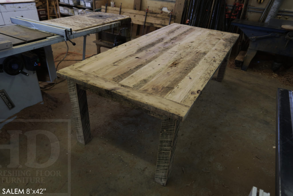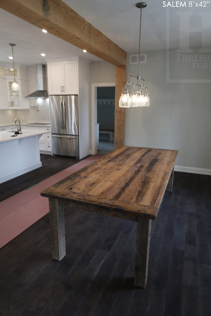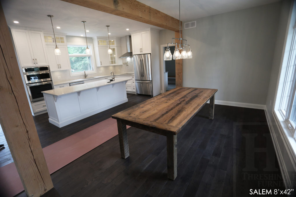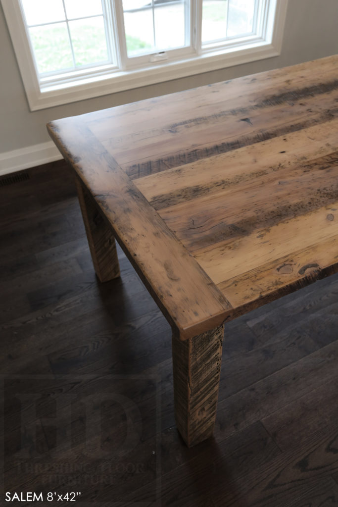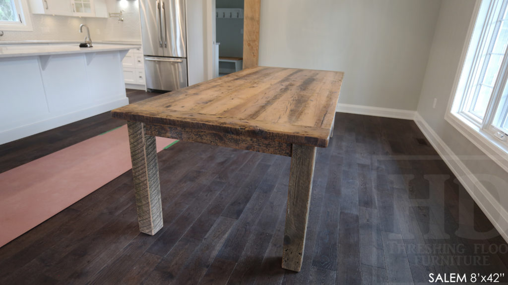 Details: 8 ft Salem, Ontario Harvest Table – 42″ wide – Reclaimed Hemlock Barnwood Construction – Premium epoxy/matte polyurethane finish – Original edges/distressing maintained – Straight 4″x4″ windbrace beam legs – 3″ grainary board skirting – Greytone Treatment to Keep Colour of Unfinished