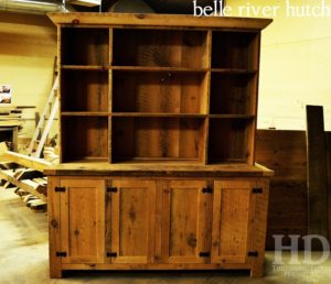 Description: 84†height – 72†wide – 4 doors – internal 1†shelving – 1†reclaimed grainery board construction – Base 36†Height & 24†deep / Top 48†Height & 16†deep – Lee Valley hardware – Reclaimed Threshing Floor Pine – Custom Spaced Shelving – Premium epoxy/matte polyurethane finish