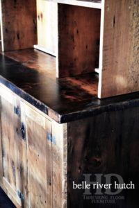 Description: 84†height – 72†wide – 4 doors – internal 1†shelving – 1†reclaimed grainery board construction – Base 36†Height & 24†deep / Top 48†Height & 16†deep – Lee Valley hardware – Reclaimed Threshing Floor Pine – Custom Spaced Shelving – Premium epoxy/matte polyurethane finish