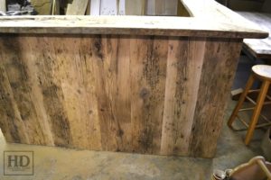 Details: Custom Reception Desk – 45″ height – Reclaimed Hemlock – Vertical 2″ threshing floor board walls – Black Stain on threshfloor walls – Premium epoxy/matte polyurethane finish – Posted by Gerald Reinink, Design & Sales