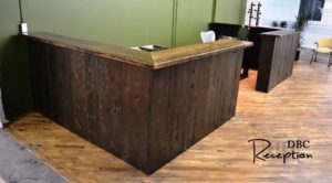 Details: Custom Reception Desk – 45″ height – Reclaimed Hemlock – Vertical 2″ threshing floor board walls – Black Stain on threshfloor walls – Premium epoxy/matte polyurethane finish – Posted by Gerald Reinink, Design & Sales