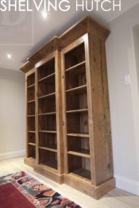 Specs: Custom Reclaimed Wood Shelving Hutch – Crown Molding – Barnwood Hemlock with Greytone Treatment to Preserve Tones of Unfinished – Polyurethane clearcoat finish – 1″ Grainery Board Construction