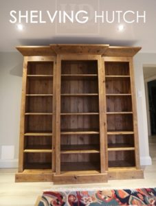 Specs: Custom Reclaimed Wood Shelving Hutch – Crown Molding – Barnwood Hemlock with Greytone Treatment to Preserve Tones of Unfinished – Polyurethane clearcoat finish – 1″ Grainery Board Construction