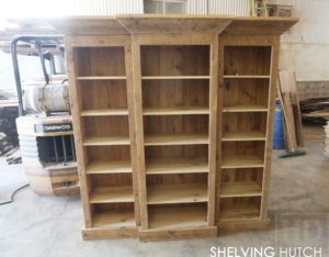 Specs: Custom Reclaimed Wood Shelving Hutch – Crown Molding – Barnwood Hemlock with Greytone Treatment to Preserve Tones of Unfinished – Polyurethane clearcoat finish – 1″ Grainery Board Construction